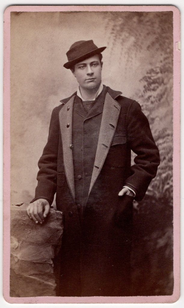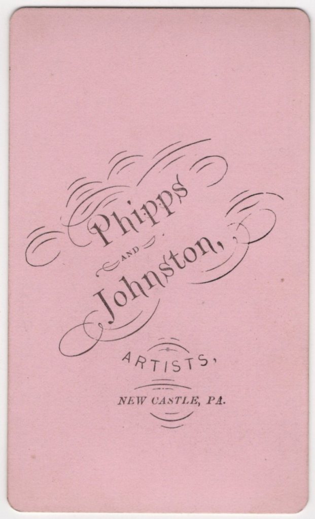 This well-executed Victorian-era carte de visite presents a confident studio portrait of a young adult man photographed by Phipps & Johnston, whose studio operated in New Castle. The subject is posed in a relaxed but self-assured stance, resting one hand casually on a rustic studio prop while the other is tucked into the pocket of his long overcoat. He wears a dark brimmed hat, a layered ensemble consisting of a buttoned waistcoat, patterned inner lapels or scarf, and a knee-length overcoat—a fashionable and practical outfit typical of the late 1860s to early 1870s. His clothing suggests a man of modest means but clear attention to style, possibly urban or industrial middle class. His expression is serious and composed, with a direct gaze that conveys quiet confidence rather than overt formality. The pose, costume, and backdrop together reflect the period’s shift toward more naturalistic studio portraiture, moving away from rigid early Victorian conventions. In regard to the photographers, one of the partners, A. W. Phipps, is known to have been Albigence Waldo Phipps (1827–1903), a professional photographer active in western Pennsylvania during the mid-to-late 19th century. Phipps operated both independently and in partnership, including this documented collaboration with Johnston. While less is known about Johnston, the joint imprint confirms a formal studio operation. This photograph appears to date back to circa late 1860’s and early 1870’s. This photograph is in very good condition with clear facial detail and strong tonal range. There is minor edge wear. The studio imprint remains sharp and legible. Overall, this about 150 year-old CDV is in good condition (see scans).