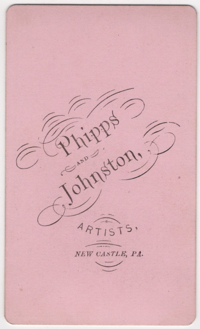This well-executed Victorian-era carte de visite presents a confident studio portrait of a young adult man photographed by Phipps & Johnston, whose studio operated in New Castle. The subject is posed in a relaxed but self-assured stance, resting one hand casually on a rustic studio prop while the other is tucked into the pocket of his long overcoat. He wears a dark brimmed hat, a layered ensemble consisting of a buttoned waistcoat, patterned inner lapels or scarf, and a knee-length overcoat—a fashionable and practical outfit typical of the late 1860s to early 1870s. His clothing suggests a man of modest means but clear attention to style, possibly urban or industrial middle class. His expression is serious and composed, with a direct gaze that conveys quiet confidence rather than overt formality. The pose, costume, and backdrop together reflect the period’s shift toward more naturalistic studio portraiture, moving away from rigid early Victorian conventions. In regard to the photographers, one of the partners, A. W. Phipps, is known to have been Albigence Waldo Phipps (1827–1903), a professional photographer active in western Pennsylvania during the mid-to-late 19th century. Phipps operated both independently and in partnership, including this documented collaboration with Johnston. While less is known about Johnston, the joint imprint confirms a formal studio operation. This photograph appears to date back to circa late 1860’s and early 1870’s. This photograph is in very good condition with clear facial detail and strong tonal range. There is minor edge wear. The studio imprint remains sharp and legible. Overall, this about 150 year-old CDV is in good condition (see scans).