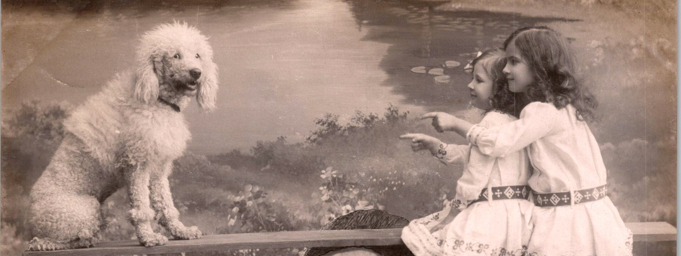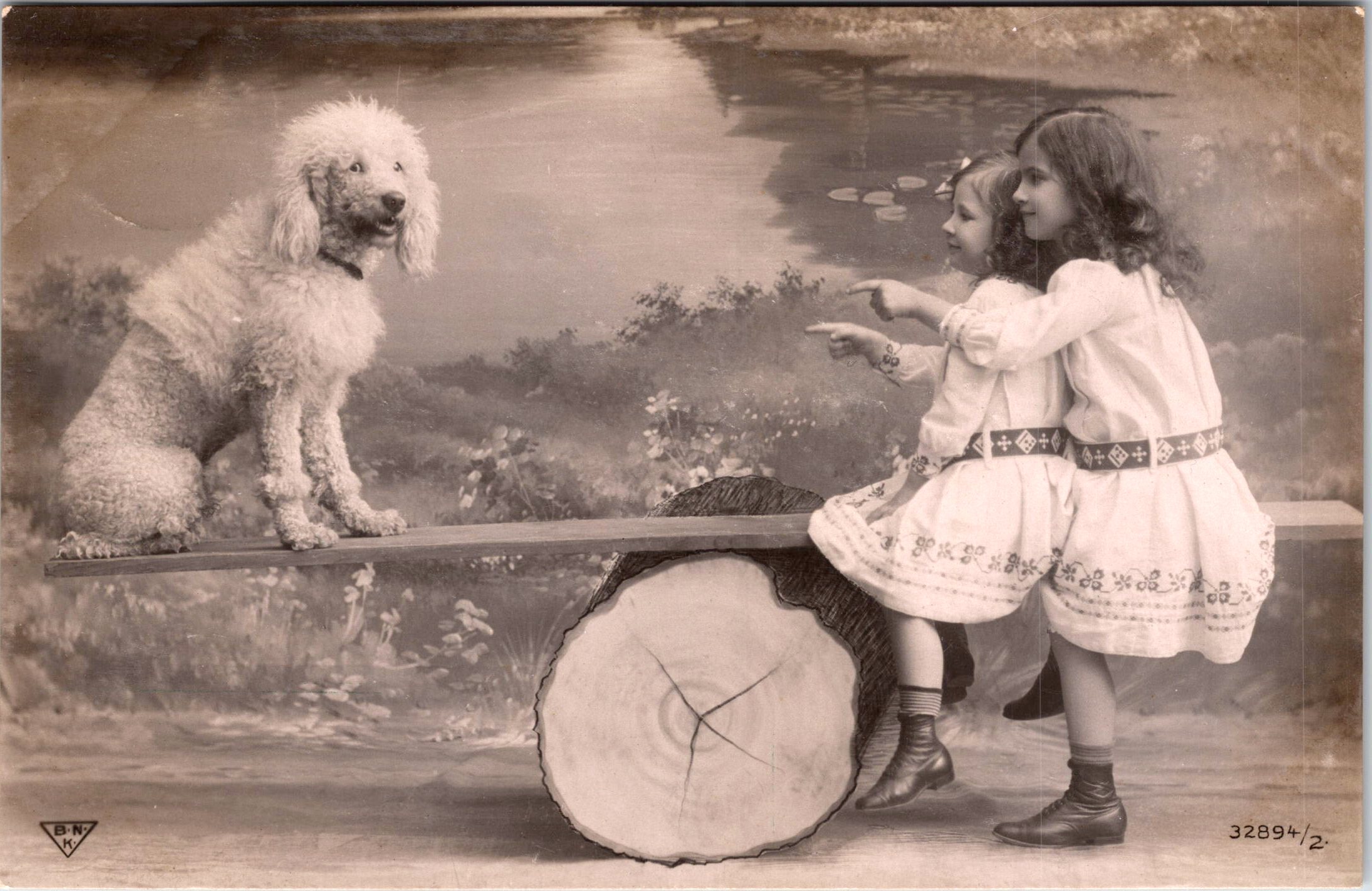 Offered here is a charming and rather uncommon early 20th-century Belgian postcard featuring two young girls engaged in a delightful outdoor scene with their dog. The composition shows the girls seated together on one end of a rustic seesaw fashioned from a plank balanced atop a large cut tree trunk, while a curly-coated dog sits attentively on the opposite end. Both girls point toward the dog, which appears to be participating obediently in their playful balancing act. The dog strongly resembles a Standard Poodle. .The setting appears to be a painted studio backdrop of a pond with lily pads and pastoral greenery. In the lower left corner of the front is a triangular publisher’s logo reading B.N.K.. The card is numbered 32894/2. This publisher is not commonly encountered. B.N.K. is the initials for “Berlin-Neuroder Kunstanstalten”, a German publishing firm. This postcard originates from Belgium, as confirmed by the stamp and postmark. Along the center dividing line, two handwritten names appear, one clearly reading Emma. The second name Drukwerk” is not a personal name — it’s a Dutch (Flemish) word that means “printed matter.” That designation allows for a cheaper postal rate than required for regular correspondence. Based on the divided back format and the style of the Belgian stamp, this postcard likely dates to approximately 1905–1915. In regard to condition, the front of the card retains strong contrast and detail. There is light corner consistent with postal use. A small “X” marking is visible on the log in the foreground, likely added later and noted for accuracy sake. Overall, the postcard is in good vintage condition for its age.