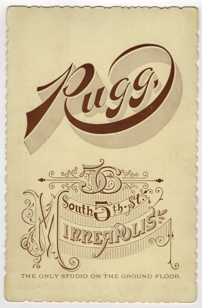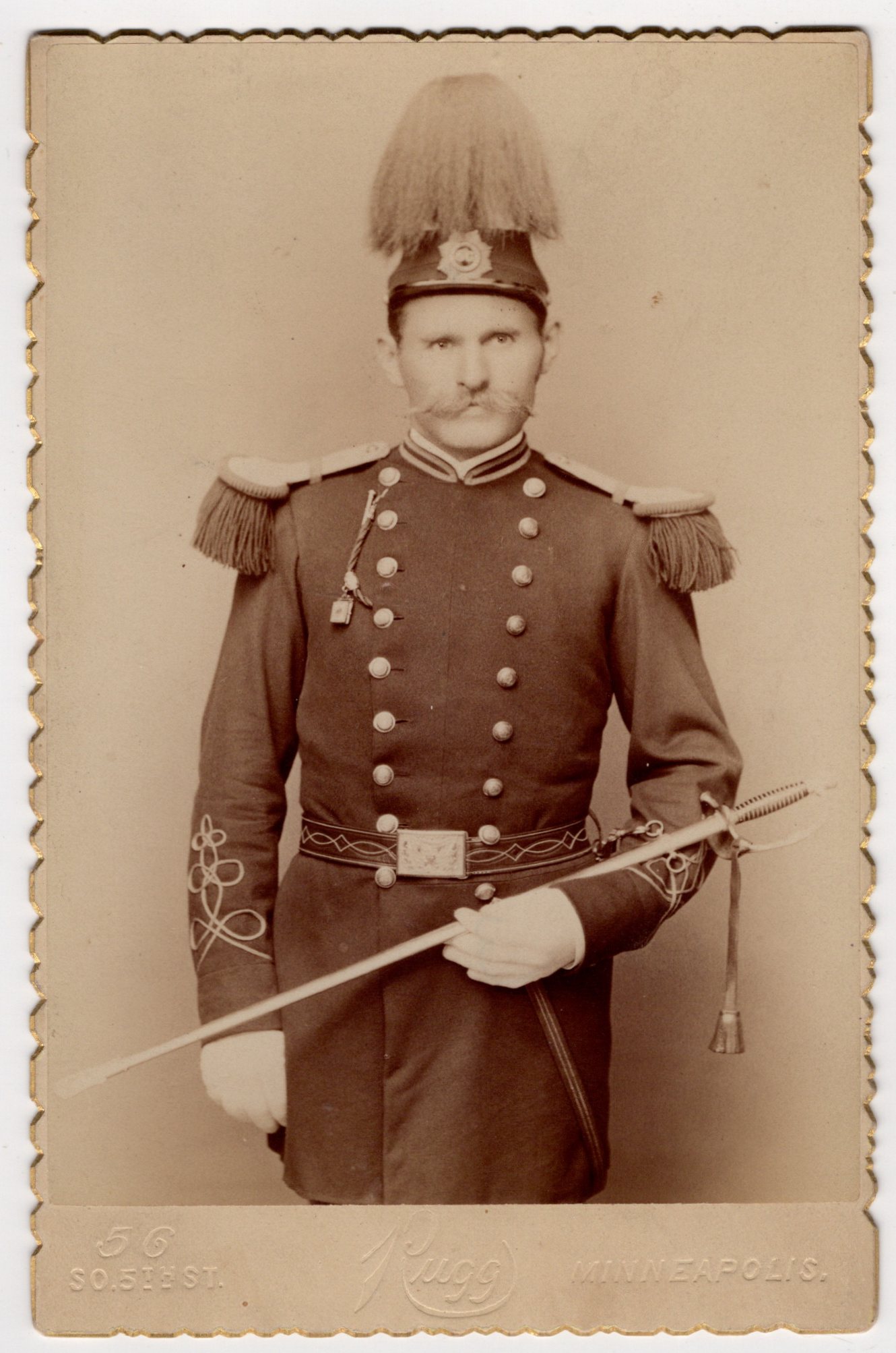 This is a striking late 19th century cabinet card photograph taken by Rugg, whose studio was located in Minneapolis, Minnesota. He proudly advertises himself on the reverse as “The Only Studio on the Ground Floor.” That bold imprint alone places this image firmly in the flourishing studio era of the 1880s–1890s. The photograph depicts a gentleman posed formally in full ceremonial fraternal regalia. He stands erect and composed, wearing a dramatic plumed helmet (shako-style) topped with a full feather plume. The helmet bears an insignia at the front, though not clearly legible enough to definitively assign to one organization. His uniform consists of a dark, double-breasted frock coat with two vertical rows of polished buttons, heavy fringed epaulettes at the shoulders, decorative braided sleeve ornamentation, and a wide ornamental belt plate at the waist. He wears white gloves and holds a ceremonial sword across his torso. A whistle or lanyard hangs from his chest, adding to the martial presentation. The overall uniform style strongly suggests affiliation with a late 19th century fraternal military-style organization. Most likely candidates include the Knights Templar (Masonic branch) or the Uniform Rank of the Knights of Pythias, both of which were extremely active in Minnesota during this period and are well known for elaborate plumed helmets and sword-bearing regalia. The gentleman’s prominent handlebar mustache and direct gaze give the portrait considerable presence. This is a classic example of Victorian fraternal pride and ceremonial pageantry. Based on mount style and studio imprint, the card likely dates to circa 1885–1895. This photo is an excellent piece of Minneapolis history and 19th century fraternal imagery. The photographer of this cabinet card image, was Arthur Rugg. Judging by other images by Rugg in my collection, Rugg was a talented photographer who had a propensity to take relatively close-up photographs. Turns out, he was also a scoundrel. Rugg received notice for being involved in a major lawsuit that had impact on the profession of photography. The American Journal of Photography (1890) reported that the Supreme Court of Minnesota handed down a decision against Rugg for selling a copy of Mrs. Ida E. Moore’s photograph “which was put on exhibition in improper places, much to the discredit of the lady”. He was ruled to have had no right to the picture which legally belonged to the sitter (Ms. Moore). She won her suit for damages of five thousand dollars although it is not clear if that was the actual amount awarded. Another photography journal of that time reported more specifics of the case. It seems that Rugg had given one of Ms. Moore’s pictures to a police detective named Clark, who showed the photos in a number of houses of ill repute in the Minneapolis and St. Paul area. The court ruled that although the negatives of the photograph belonged to Rugg, he could not print photographs from those negatives without permission from Ms Moore. Mr Rugg seems to have lacked some ethics in this instance.