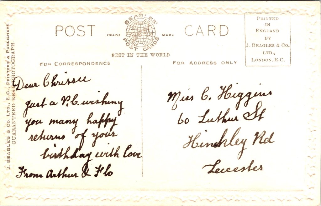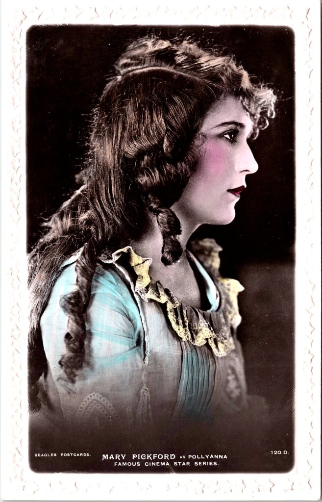 Mary Pickford (1892-1979) was a Canadian-American actress and one of the most influential figures in early Hollywood. She was often referred to as “America’s Sweetheart”. She was a pioneer of silent film and a co-founder of the film industry as we know it today. Pickford’s career began in childhood when she performed in theater productions in Canada and the United States. By the early 1900s, she transitioned to film, working with director D.W. Griffith at Biograph Studios. Her delicate beauty and expressive acting quickly made her a fan favorite, setting her apart in an era when exaggerated stage-style performances dominated silent films. During the 1910s and 1920s, Pickford became one of the highest-paid and most beloved actresses in the world. Starring in films such as Rebecca of Sunnybrook Farm (1917), Daddy-Long-Legs (1919), and Pollyanna (1920), she was known for playing wholesome, spirited young women. Her curly hair and signature on-screen innocence became iconic, but she was also a savvy businesswoman who understood the power of her brand. Pickford was not only a star but also a trailblazer in the film industry. In 1919, she co-founded United Artists alongside Charlie Chaplin, Douglas Fairbanks (her then-husband), and director D.W. Griffith. This revolutionary move allowed filmmakers to control their own productions rather than rely on major studios, changing the industry forever. As the film industry transitioned to “talkies,” Pickford retired from acting in the early 1930s, though she continued to produce films. Her contributions earned her an honorary Academy Award in 1976 for her lasting impact on cinema. Mary Pickford’s influence extends beyond her films. She helped shape the star system, paved the way for women in Hollywood, and co-founded the Motion Picture Relief Fund to support struggling actors. She remains an enduring symbol of early Hollywood glamour and innovation. Mary Pickford was born into a working-class family in Toronto, Canada. Her father, John Charles Smith, was an alcoholic who struggled to provide for the family and died from a workplace accident when Mary was just six years old. Her mother, Charlotte Hennessey Smith, was left to raise Mary and her two younger siblings, Lottie and Jack, on her own. To support the family, Charlotte encouraged her children to enter acting, and Mary began performing in theater at a young age. She soon became the family’s primary breadwinner, and her siblings, Lottie Pickford and Jack Pickford, also pursued film careers. Pickford transitioned from theater to film in the early 1900s, quickly rising to fame with her expressive acting and wholesome on-screen persona. By the 1910s and 1920s, she was one of the most recognizable stars in the world, earning the nickname “Queen of the Movies.” She also helped establish the Academy of Motion Picture Arts and Sciences. Mary Pickford was married three times. Pickford’s first marriage was to silent film actor Owen Moore (1911-1920). Her second and most famous marriage was to fellow silent film actor, Douglas Fairbanks (1920-1936). Her third marriage was to actor Charles “Buddy” Rogers (1937-1979). After retiring from acting in the early 1930s, Pickford focused on producing films and philanthropy. She became more reclusive in her later years, struggling with alcoholism and health issues. Today, she is remembered as a pioneering force in cinema history. This original real photo postcard (RPPC) features the legendary Pickford in her role as Pollyanna from the 1920 United Artists film Pollyanna. The image is hand tinted. The postcard was published in the United Kingdom by Beagles & Company. The card was meant to promote the film. “Pollyanna” was a silent film released in 1920 and Pickford was it’s star. The film was based on the 1913 novel by Eleanor H. Porter, the story follows an optimistic young orphan named Pollyanna who is sent to live with her stern, crotchety Aunt Polly in a dour New England town. Pollyanna transforms the lives of the cynical townspeople by teaching them the “glad game”—a challenge to find something to be glad about in every situation, no matter how difficult. This was the first film released by United Artists, the independent studio Pickford co-founded with Charlie Chaplin, D.W. Griffith, and Douglas Fairbanks. Despite being 27 years old at the time, Pickford played the role of the 12-ye The film was a massive commercial hit, grossing over $1.1 million, which was an astronomical sum for the era. Her success in the role was so immense that she continued to play “little girl” characters for several more years. This postcard has an ornate border and is in excellent condition (see scans).