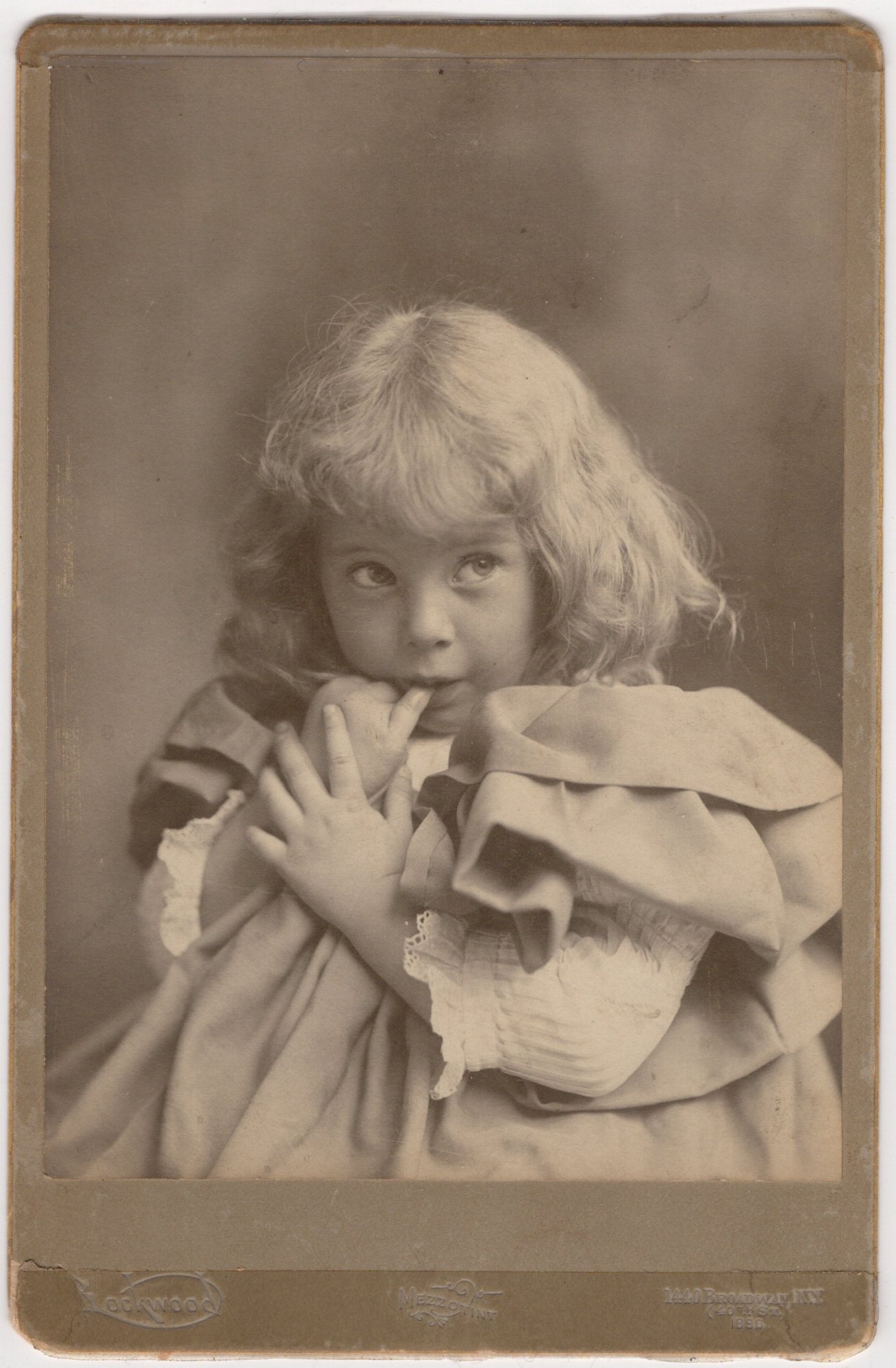 This charming late-Victorian cabinet card captures a little girl with a wonderfully coy, precocious expression—eyes turned to the side as if she’s sharing a private thought with the photographer. Her softly curled hair, the oversized bow, and the gentle studio lighting create that classic 1890s “storybook” portrait look. The pose feels spontaneous and intimate; displaying this adorable girl’s personality. The photographer is George Gardner Rockwood, one of New York City’s best-known portrait men of the era. Rockwood’s studio became a major name in celebrity and society photography, and surviving cabinet cards with his imprint are widely collected today. The New York Public Library’s Photographers’ Identities Catalog documents Rockwood operating a New York City studio/business in the period 1894–1902, specifically at 1440 Broadway (the same address printed on this mount). Rockwood’s career is also well summarized in reference sources that note his long life (1832–1911) and his enormous output of portraits over decades in the business. Rockwood was born in Troy, New York and graduated from college with a PhD, reportedly either from the University of Chicago, or Columbia University. At 21 years of age, he was a newspaper reporter for the Troy Daily Times and at age 23, he was managing editor of the Troy Daily Post. He began working as a photographer in St. Louis and in 1857 opened a studio with his brother Elihu in New York City. He has been credited with bringing CDV’s to America. His obituary in the Washington Post reports that Rockwood photographed more than 350,000 people. This photograph was taken in 1896. That date appears in the lower right corner of the cabinet card, under the studio’s address. Overall, this cabinet card presents beautifully, with a soft tonal range and good facial clarity. There is age wear to the mount, including edge/corner wear and scuffing, and what appears to be a small wrinkle near the bottom corners (see scans).