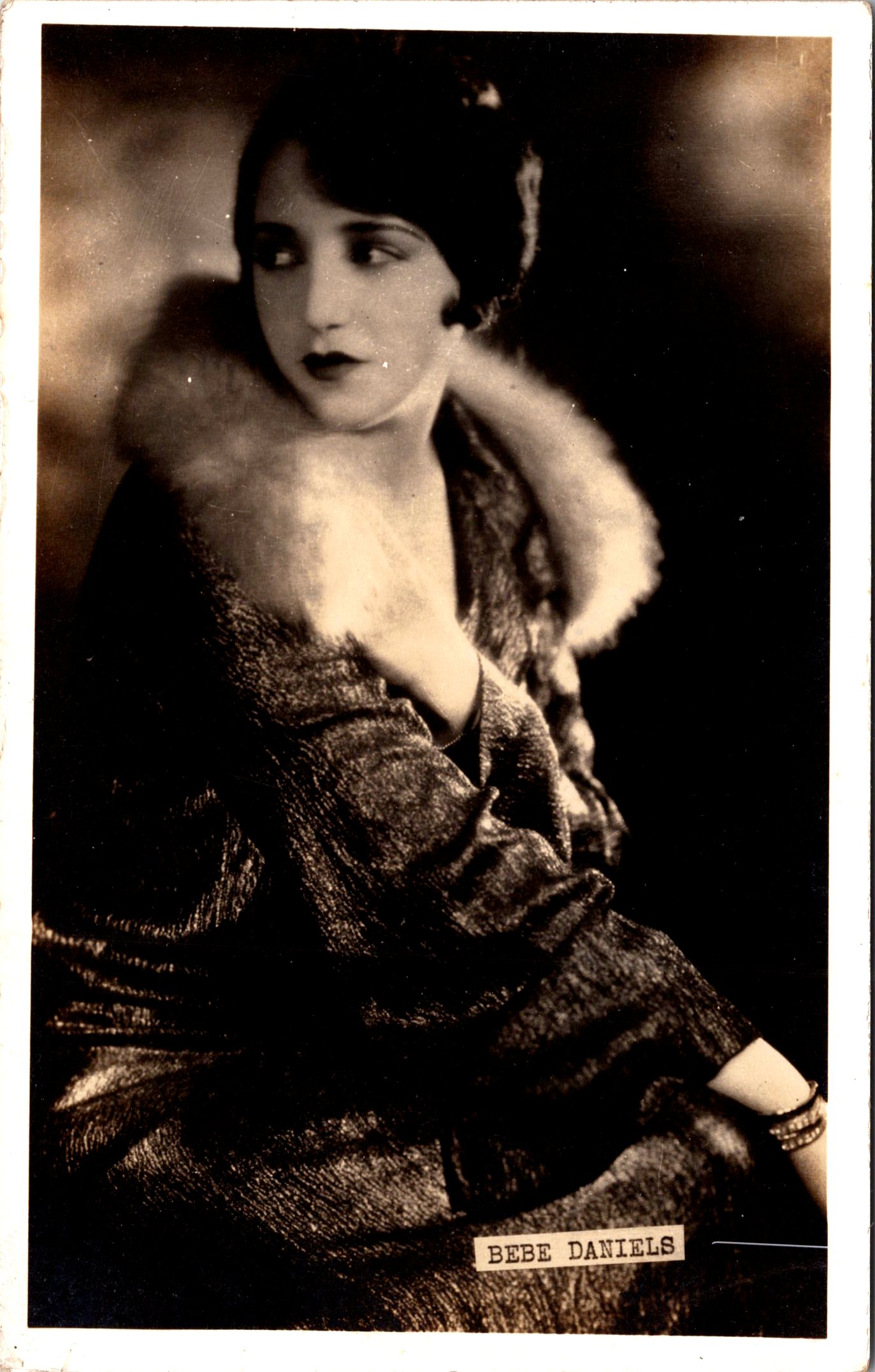This vintage real photo postcard feature actress Bebe Daniels (1901-1971). Miss Daniels is beautiful. She is nicely dressed and her outfit includes furs. She is wearing a large ring and a necklace with a cross. Bebe Daniels was an American actress, singer, dancer, writer and producer. She was born in Dallas, Texas to show business parents. Her father was a theater manager and her mother was a stage actress. She started her career in Hollywood as a silent film child actress. She became a star in musicals such as “42nd Street”. She worked opposite Harold Lloyd and was under contract with Cecil B. DeMille. She later became a popular radio and television actress in Great Britain. In the 1920’s she was under contract with Paramount Pictures and made the transition to adult roles. In 1924 she played opposite to Rudolph Valentino in “Monsieur Beurcaire”. She also recorded songs for RCA Victor. When talkies began, she was hired by RKO. While with RKO her movies included a number of musicals such as “Dixiana” (1930) and “Love Comes Along” (1930). Over the course of her career, she appeared in 230 films. She retired from Hollywood in 1935. After World War II she was awarded the Medal of Freedom by President Truman for her service during the war. An interesting story concerning Miss Daniels is that while appearing in a Chicago hotel, several thousand dollars worth of her jewelry was stolen from her hotel room. Al Capone, the notorious gangster, was a longtime Daniels fan and put out an order that the thief had just 24 hours to return it “or else”. The jewelry was returned the following day. This postcard was published by SSSS sometime between 1924 and 1929. This postcard remains in good overall vintage condition. The image itself is strong, with deep contrast and excellent tonal range — the facial features and dark costume details remain crisp and well defined. There is scattered light surface wear visible under close inspection, including minor speckling typical of age. The white border shows light corner wear. There are no creases or tears (see scans).