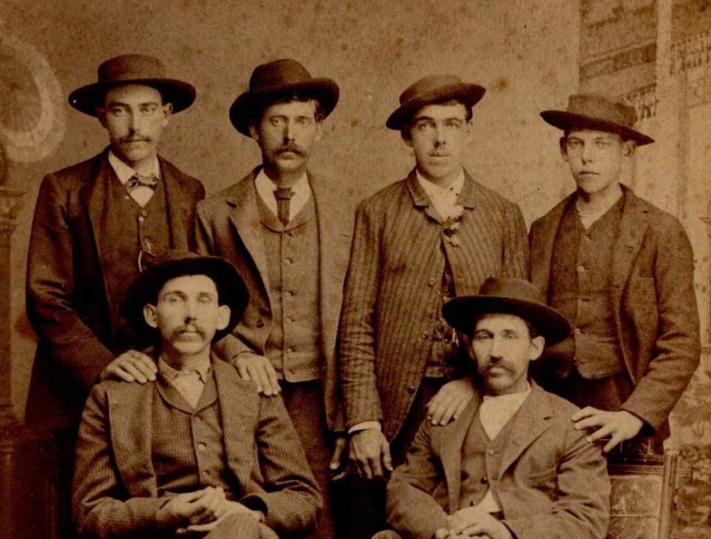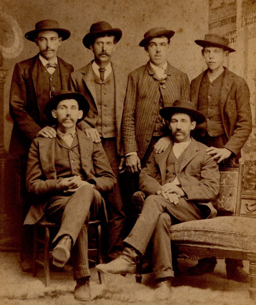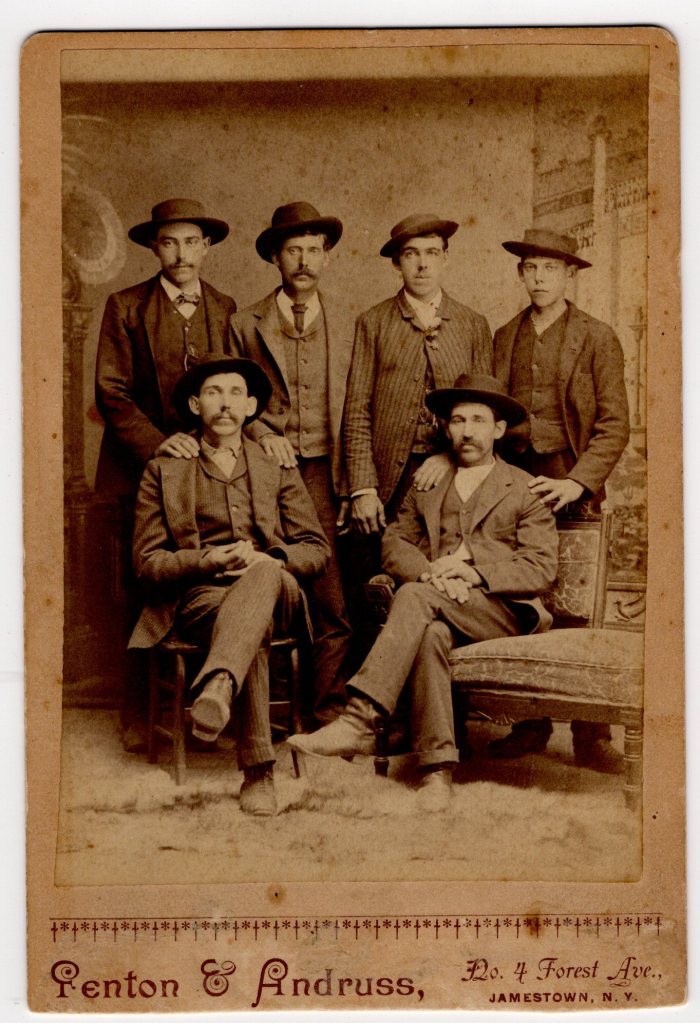 This striking original cabinet card photograph dates from the late 19th century, likely circa 1890, and captures a group portrait of six well-dressed men posing in a photographic studio in Jamestown, New York. The image was taken by Penton & Andruss, located at No. 4 Forest Ave., Jamestown, N.Y., as identified by the ornate imprint on the front mount. The men are dressed in typical late Victorian attire, wearing a variety of three-piece suits, waistcoats, high-collar shirts, and neckties or cravats. Each man wears a broad-brimmed hat, suggesting either a regional or occupational identity—possibly connected to rural life, ranching, or even a fraternal organization. The group is arranged in a formal pose: four men standing in the back and two seated in front on elegant studio furniture. The backdrop features painted columns and drapery, a common studio motif of the period meant to evoke elegance and sophistication. The seated men have a relaxed posture, one with legs crossed and hands folded in his lap, while the other leans slightly forward with a composed, confident expression. Each subject maintains a serious or neutral facial expression—typical for 19th-century portraiture due to long exposure times and social conventions around photographic solemnity. Penton & Andruss, the photographers, was a partnership based in Jamestown, New York during the late 19th century. While detailed biographical records on the firm are limited, they appear in regional business directories and period listings as active professional photographers. Jamestown was a thriving industrial and lumber town during this period, and it’s possible that these men were involved in local trades or belonged to a community club, union, or fraternal society. (SOLD)