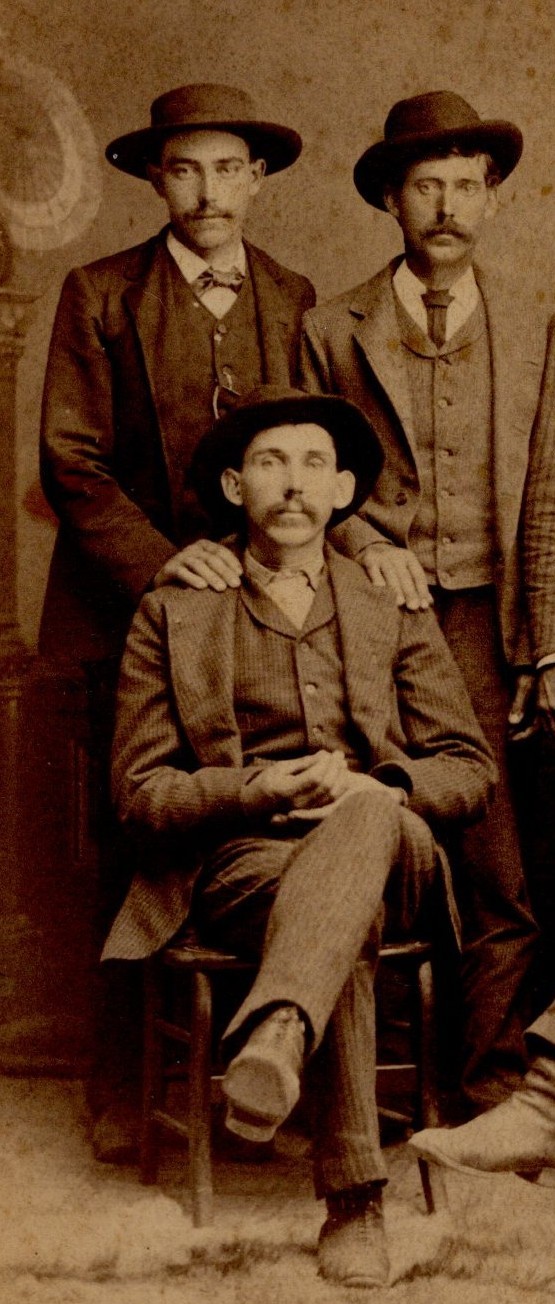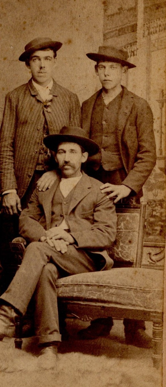 This striking original cabinet card photograph dates from the late 19th century, likely circa 1890, and captures a group portrait of six well-dressed men posing in a photographic studio in Jamestown, New York. The image was taken by Penton & Andruss, located at No. 4 Forest Ave., Jamestown, N.Y., as identified by the ornate imprint on the front mount. The men are dressed in typical late Victorian attire, wearing a variety of three-piece suits, waistcoats, high-collar shirts, and neckties or cravats. Each man wears a broad-brimmed hat, suggesting either a regional or occupational identity—possibly connected to rural life, ranching, or even a fraternal organization. The group is arranged in a formal pose: four men standing in the back and two seated in front on elegant studio furniture. The backdrop features painted columns and drapery, a common studio motif of the period meant to evoke elegance and sophistication. The seated men have a relaxed posture, one with legs crossed and hands folded in his lap, while the other leans slightly forward with a composed, confident expression. Each subject maintains a serious or neutral facial expression—typical for 19th-century portraiture due to long exposure times and social conventions around photographic solemnity. Penton & Andruss, the photographers, was a partnership based in Jamestown, New York during the late 19th century. While detailed biographical records on the firm are limited, they appear in regional business directories and period listings as active professional photographers. Jamestown was a thriving industrial and lumber town during this period, and it’s possible that these men were involved in local trades or belonged to a community club, union, or fraternal society. (SOLD)