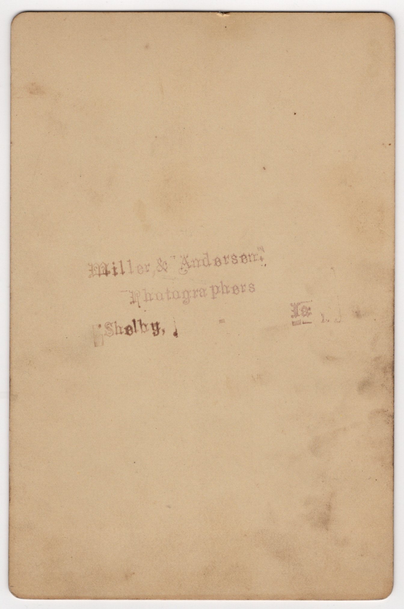 Three neatly dressed siblings pose on an elaborate studio set meant to evoke a grand front porch. The children stand on faux stone steps framed by a carved balustrade and an ornate painted backdrop that suggests a Victorian doorway with decorative leaded glass. A scatter of dried “grass” on the floor and a tasseled straw bonnet draped over a brocade armchair complete the illusion of an outdoor scene brought indoors. The eldest girl (seated, about 8 yrs of age) wears a practical, mid-brown day dress gathered at the high waist, with inset smocking and a crisp self-fabric bow on the bodice. Her lace-edged collar and tightly laced, mid-calf button boots attest to middle-class respectability. She looks straight into the camera with a composed, almost adult seriousness, hands folded demurely. The youngest child (standing left of steps, is about 5 yrs old) sports a darker pinafore-style dress over a lighter blouse with a deep lace collar. Tousled blond hair and the small doll clutched in her right hand hint at a restless energy; her wide-eyed expression is inquisitive rather than shy. The middle child (standing right, about 6 yrs of age) is dressed in a pleated black wool dress with bishop sleeves and another lace collar. One hand rests confidently on the carved railing; her level gaze and slightly pursed lips convey the earnest formality children often adopted for long photographic exposures. The dog is a small terrier-type dog and it sits statue-still on the middle step. Close inspection shows a glossy coat, natural posture, and slight blur at the muzzle—signs it is a live pet briefly held in position rather than a taxidermy studio prop. Including a real dog was a mark of photographic bravado, as animals could easily ruin an exposure. The probable date that this photograph was taken, judging by hemlines and hair styles point to between the late 1880’s and early 1990’s. Very little survives about this short-lived partnership beyond the faint back-stamp on the reverse of the card. The best-documented local photographer is P. Andersen, listed as operating in Shelby in 1891 and again in nearby Kimballton. No information about photographer, Miller, was discovered in preliminary research. Shelby sprang up along the Chicago, Rock Island & Pacific line in 1868, was platted in 1870, and incorporated in 1877. By the 1890 census the town counted roughly 650 residents (Shelby County total 17,611), serving as a grain-shipping point for surrounding farms. Main-street businesses—including at least two photo galleries—catered to a growing, rail-connected farm community. (SOLD)