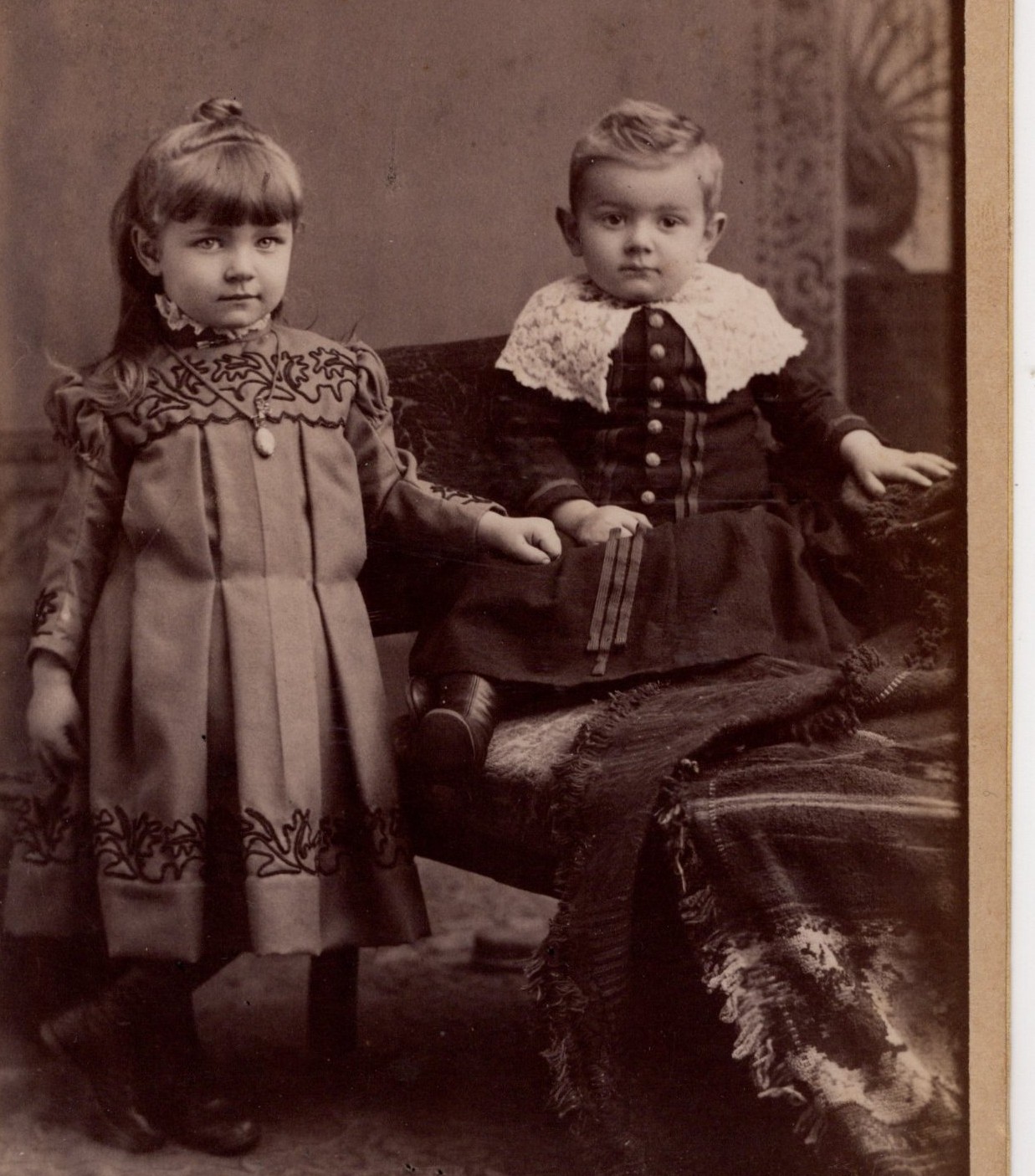 This charming late nineteenth-century cabinet card was photographed by W.J. Richardson of Oneida, New York, and depicts a beautifully dressed young girl standing beside a seated toddler boy in a carefully arranged studio interior. The girl wears her hair in long braids and is adorned with decorative buttons or breast ornaments that add visual interest to her otherwise modest Victorian dress. She stands confidently, her posture poised and composed. She is adorable. Beside her, the younger boy sits with a softer, slightly tentative expression, creating a lovely contrast between sibling composure and childhood vulnerability. The “big sister” seems to be assuming a protective posture in relationship to her sibling. Both children share pleasant smiles. The careful posing, the understated backdrop, and the children’s clothing all reflect the aesthetic sensibilities of the 1880s–1890s, when cabinet cards were at the height of their popularity. The mount style and photographic tone strongly suggest a date in the late 1880s to early 1890s. The image retains strong contrast with tonal depth. There is light, even age toning consistent with photographs of this period. The mount shows gently rounded corners, and the cabinet card remains solid and structurally sound. The cabinet card has gold beveled edges which are in good condition. Overall, the card presents in very good antique condition and displays beautifully (see scans).
