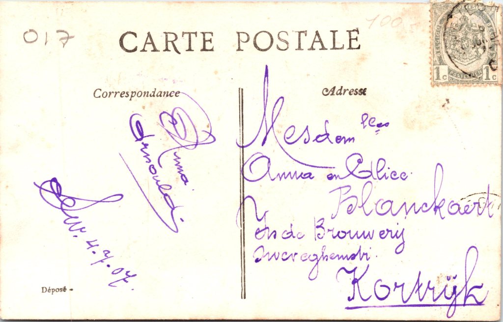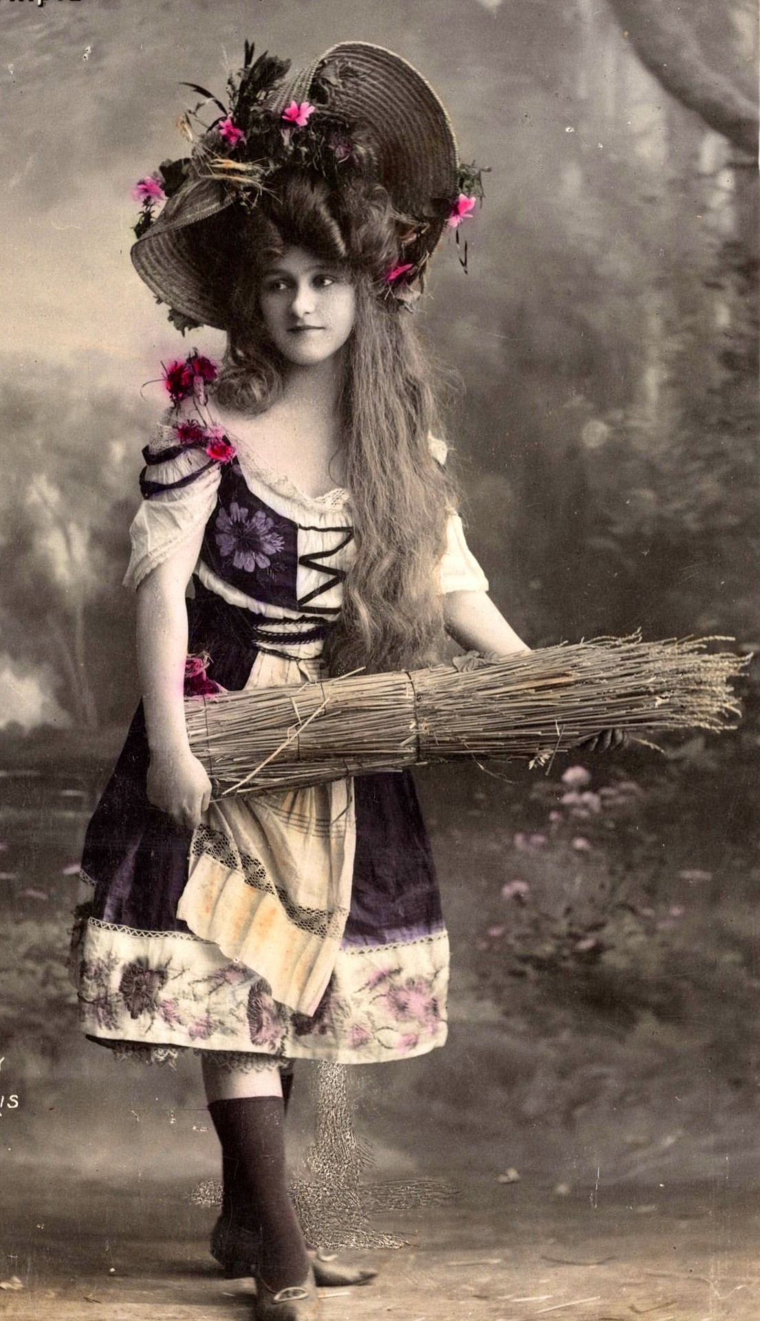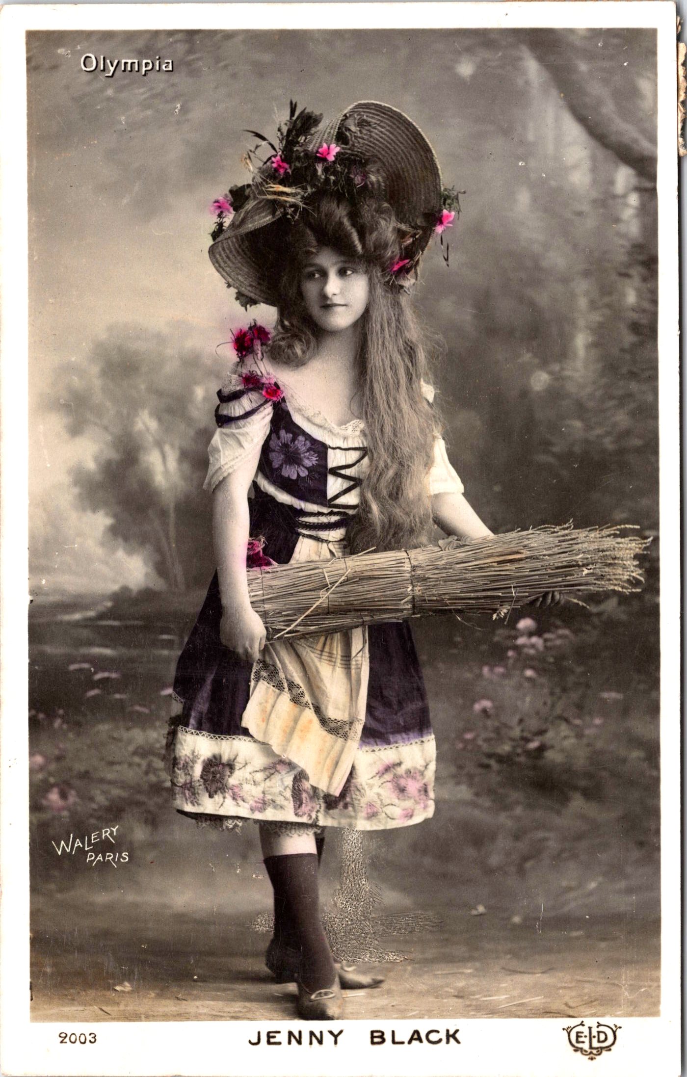 This is a rare and beautiful hand-tinted theatrical postcard featuring the performer Jenny Black, photographed by Walery of Paris, one of the most celebrated society and theatrical photographers of the Belle Époque. In the upper left corner of the image appears the word “Olympia,” referring to the famous Olympia Theatre in Paris, the legendary music hall founded in 1888 by Joseph Oller, which became one of Europe’s premier venues for revue, operetta, and variety performers. The association with the Paris Olympia situates this image firmly within the vibrant theatrical culture of early twentieth-century France. Jenny Black is depicted in a charming pastoral costume, suggestive of a stage role. She stands in a studio setting designed to evoke the countryside, holding a bundled sheaf of wheat in her arms, perhaps portraying a rustic maiden or harvest girl in a musical or operetta production. Her elaborate wide-brimmed hat is richly adorned with feathers and hand-applied pink floral accents, which are delicately tinted along with the flowers on her bodice and skirt. Her long flowing hair cascades over one shoulder, and she gazes slightly off to the side with a soft, composed expression. The costume itself is highly decorative — a dark bodice with floral detailing, light puffed sleeves, corset lacing at the front, and a patterned hemline. The careful hand coloring adds warmth and dimension, particularly to the flowers and subtle blush tones.The photographer, Walery (a studio name used by the Walerian family of photographers and later by successors), was known for producing high-quality theatrical portrait postcards during the height of the postcard collecting craze. At the lower right appears the publisher’s monogram “E.L.D.” with decorative framing, which corresponds to the Paris publisher Ernest Le Deley, a firm active in the early 1900s that issued many theatrical and glamour portrait cards. The card is numbered “2003” which suggests it is part of a series. The postcard bears a Belgian 1 centime stamp with a circular cancellation. The handwritten date reads 1907. The cards condition is very good for age, with light corner wear. The hand-tinting remains attractive and well preserved. The reverse shows typical aging and postal cancellation, but remains clean and fully legible (see scans). This is a striking Belle Époque theatrical portrait from one of Paris’s most important stages with the artistry of Walery’s studio and the glamour of the Olympia Theatre.