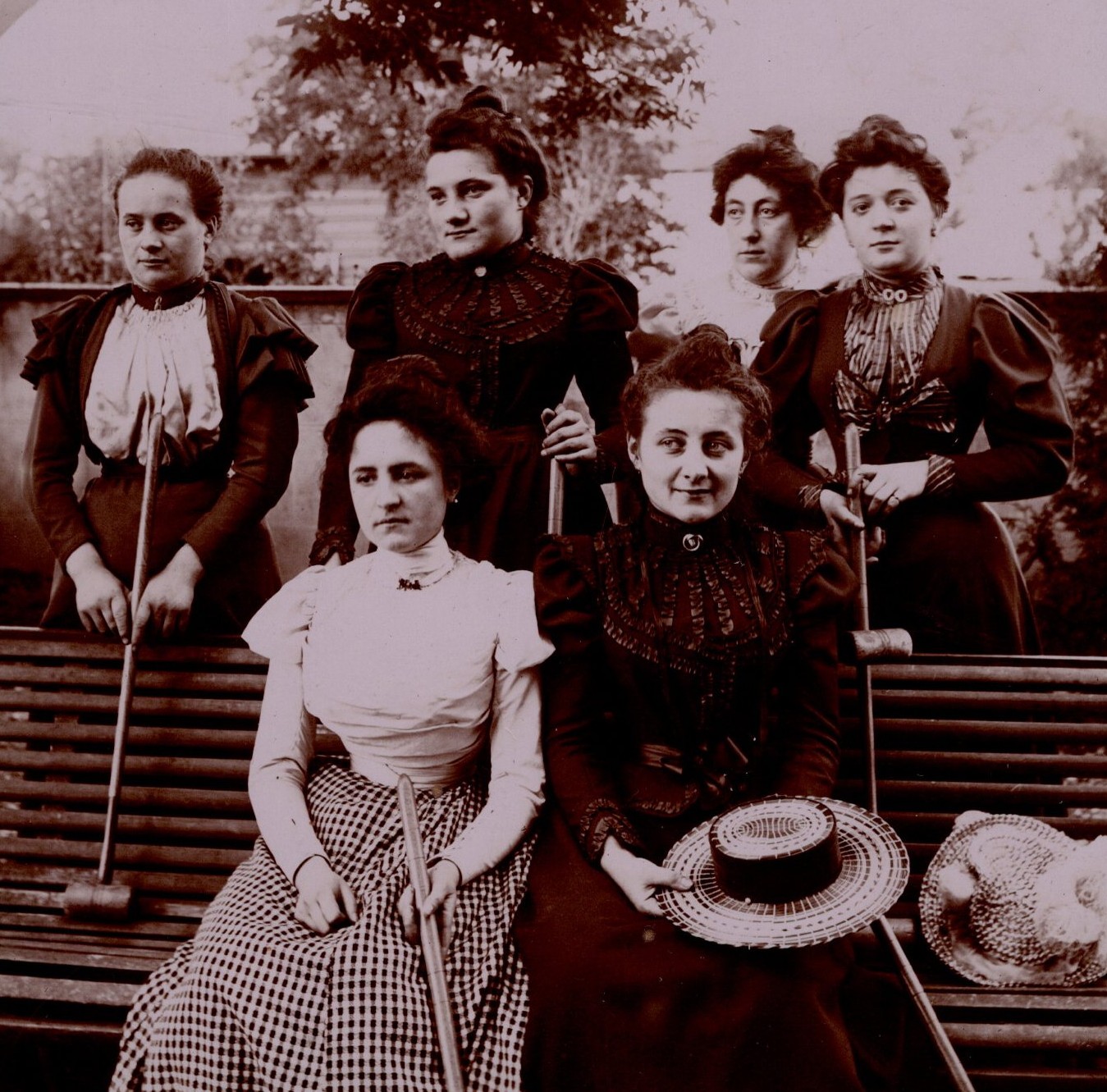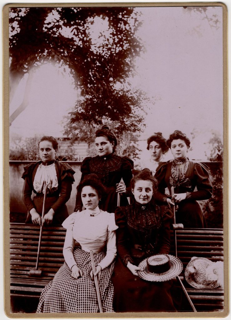 This is a wonderfully candid-feeling group portrait of six young women taking a breather from a game of croquet. They’re perched across a slatted garden bench beneath a big shade tree, each with a mallet either resting in her hands or propped against the seat. Two straw hats—one a jaunty boater—sit on the bench like time-capsule props. Nobody is posing stiffly; there’s the relaxed camaraderie of friends who’ve been laughing and competing all afternoon. Clothing helps date the scene to the late 1890s–very early 1900s. We get classic leg-of-mutton sleeves, high collars, pin-tucked bodices, and waist belts, with hair dressed up in the fashionable pompadour style. The woman at left looks off with a serious “game face,” the two standing in the middle wear tiny, knowing smiles, and the two seated in front give us the best expressions: one cool and composed with her mallet across her lap, the other glancing sideways with a mischievous, almost conspiratorial look. It’s easy to imagine them as a local club, sisters, or classmates—Victorian sport as social life is exactly what made croquet so popular. (SOLD)