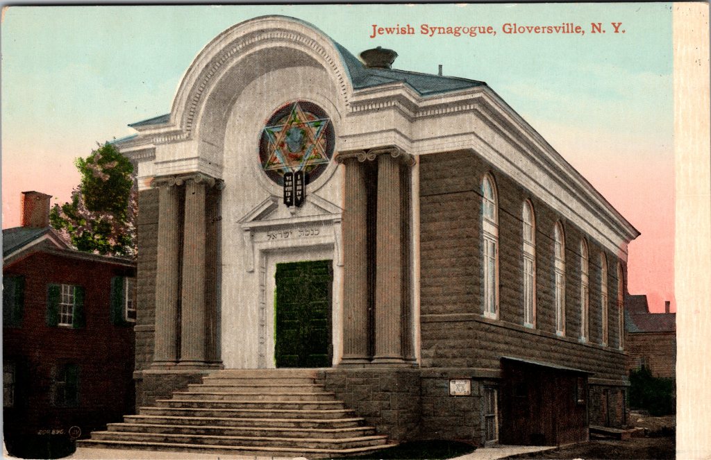This vintage postcard features the Jewish synagogue located in Gloversville, New York. Note the Star of David window. Gloversville is a community located in upstate New York. German Jews settled in the area in th 1850’s. This turn of the century (c.1900’s) postcard was published by V. & Sons (New York and Boston) and printed in the United States. SOLD