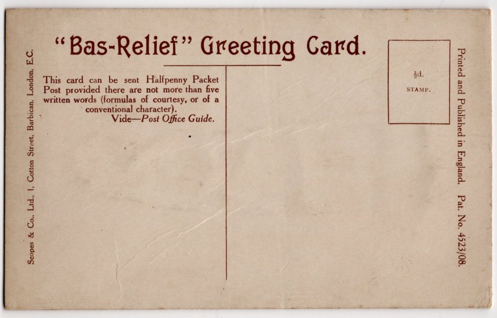 Postcard 1 is a striking Edwardian “Bas-Relief” theatrical portrait featuring English stage performer Florence Kendall, who appeared in musicale and dramatic productions in the early 20th century. The image beautifully captures the soft romanticism of pre-WWI theatrical photography, when actresses were often posed in dreamy, poetic attitudes to reflect elegance, youth, and refinement. Florence Kendall appears here in a gentle three-quarter pose, her head gracefully tilted as she gazes toward the camera with a quiet, introspective expression. Her long dark hair flows loosely over one shoulder, tied with a soft white ribbon at the back — a style aligned with Edwardian ideals of natural feminine beauty. She wears a sheer, light-colored gown with delicate lace or embroidered detailing at the neckline and sleeves, giving the portrait an ethereal, almost fairytale quality. The overall impression is one of youthful grace and gentle charm. The postcard is part of the “Bas-Relief” series, patented in 1908, a premium card type created to mimic low-relief sculpture. The photographic surface creates subtly raised tonal depth, giving the sitter a more dimensional, sculpted look compared to ordinary flat postcards. These special cards were marketed as high-quality portrait editions and are collected today for their unique visual effect and heavier, cabinet-card-style feel. Published by Scopes & Co. Ltd. (London), a known early 20th-century publisher specializing in theatrical and novelty cards. The patent imprint (Pat. No. 4523/08) helps date this card firmly to the late Edwardian era (ca. 1908–1915). The reverse carries a charming handwritten message and original King George VI red “1d” postage stamps. The message reads: “Dear A & all, We arrived home O.K. & enjoyed coming, shall come again soon. We missed bus at Gainsborough. Had to wait till 7:30. So cheerio. Lots of Love”. (SOLD)