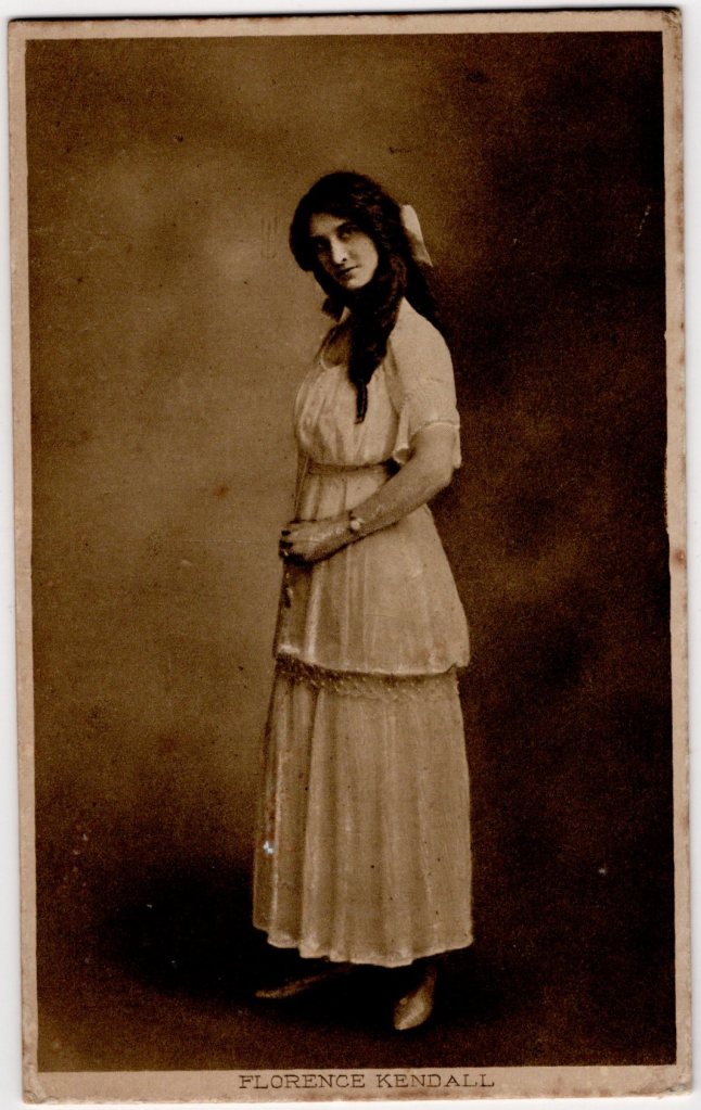 Postcard 2 is a striking early theatrical portrait featuring Kendall in an expressive pose and flowing gown, capturing the soft, romantic theatrical style that defined Edwardian theatre photography. The image shows Kendall in a full-length pose wearing a delicate white dress with lace and ribbon accents. Her soft profile, long loose hair and period costume make this an elegant study typical of British theatrical postcards before World War I. (SOLD)