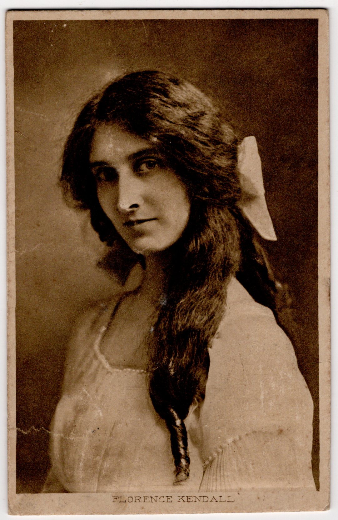 Postcard 2 is a striking early theatrical portrait featuring Kendall in an expressive pose and flowing gown, capturing the soft, romantic theatrical style that defined Edwardian theatre photography. The image shows Kendall in a full-length pose wearing a delicate white dress with lace and ribbon accents. Her soft profile, long loose hair and period costume make this an elegant study typical of British theatrical postcards before World War I. (SOLD)