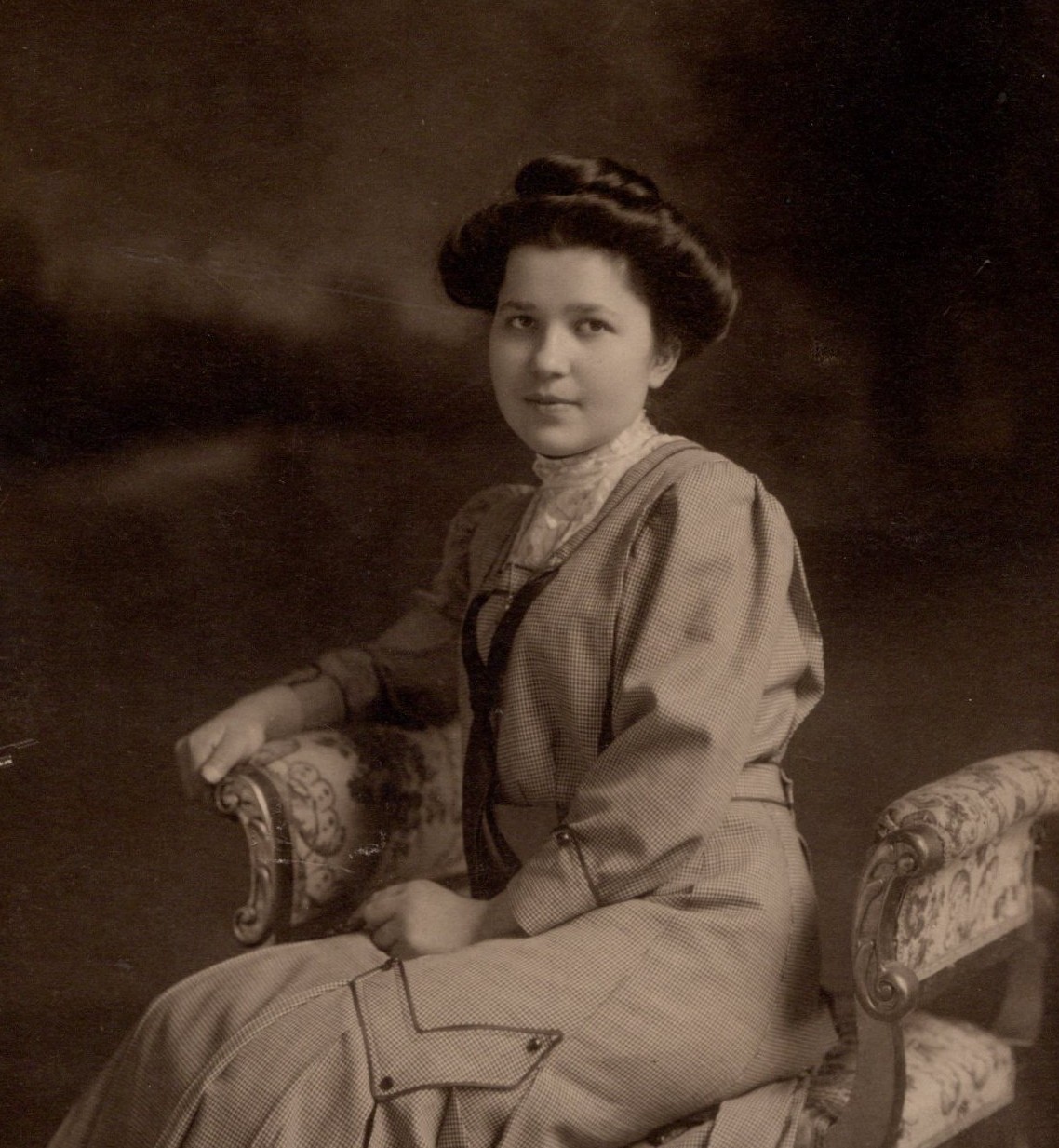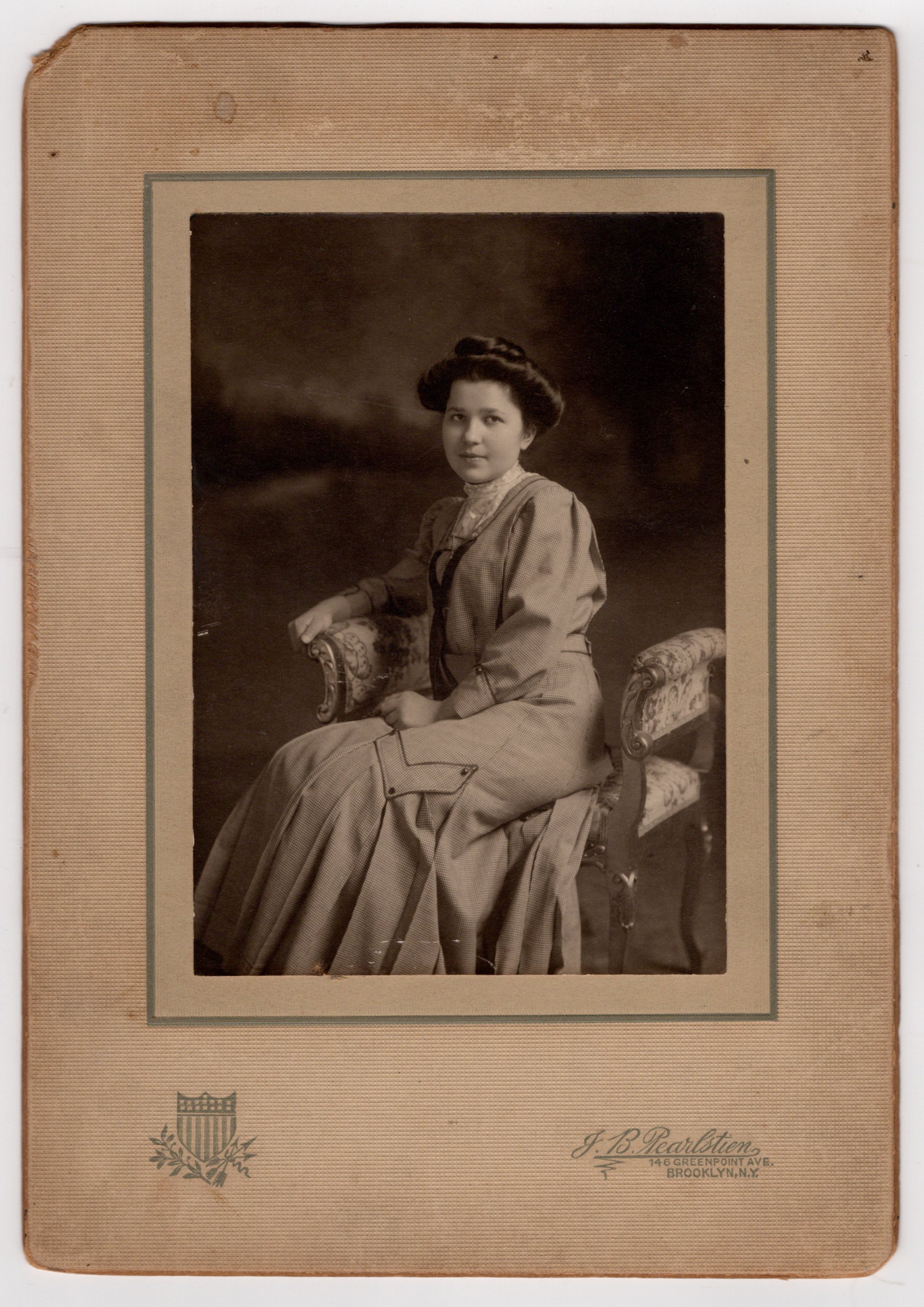 This photograph is mounted on a textured cabinet card mount measuring about 6.25 by 9 inches, with the photographic image itself measuring about 4 by 5.5 inches. The mount features a decorative crest emblem printed near the lower left corner, while the photographer’s imprint (J. B. Pearlstien) appears at the lower right.The studio address places the studio in the Greenpoint neighborhood of Brooklyn, an area that experienced substantial industrial and residential growth during the late nineteenth and early twentieth centuries. Greenpoint developed into a busy working-class district with factories, shipyards, and immigrant communities. Pearlstien was a talented photographer. The refined composition, elegant lighting, and carefully arranged pose suggest the work of an experienced studio photographer. Portraits of this style were particularly popular between about 1905 and 1915, when cabinet card mounts were still used but photographic formats were gradually shifting toward smaller prints and postcards. Here is some information about the photographer. Julius Bernhardt Pearlstien is listed in Trows Business Directory of the Boroughs of Brooklyn and Queens (1899) as operating a photography studio at 39 Greenpoint Avenue in Brooklyn. He was born sometime between 1877 and 1879. Pearlstien became a US citizen in 1900 while living in Brooklyn. He registered for the draft (World War I) in Brooklyn in 1917. In regard to condition, the photograph itself remains clear and well preserved, with good contrast and pleasing tonal range. The image has surface wear at its center bottom. The mount shows age-related wear consistent with its age, including light toning and handling marks. There is a small chipped corner at the upper left of the mount, along with minor edge wear. The reverse shows areas of surface disturbance where an old album mount or adhesive may once have been present. Despite these signs of age, the cabinet card remains an attractive and displayable antique portrait, with the image itself remaining strong and visually appealing (see scans).