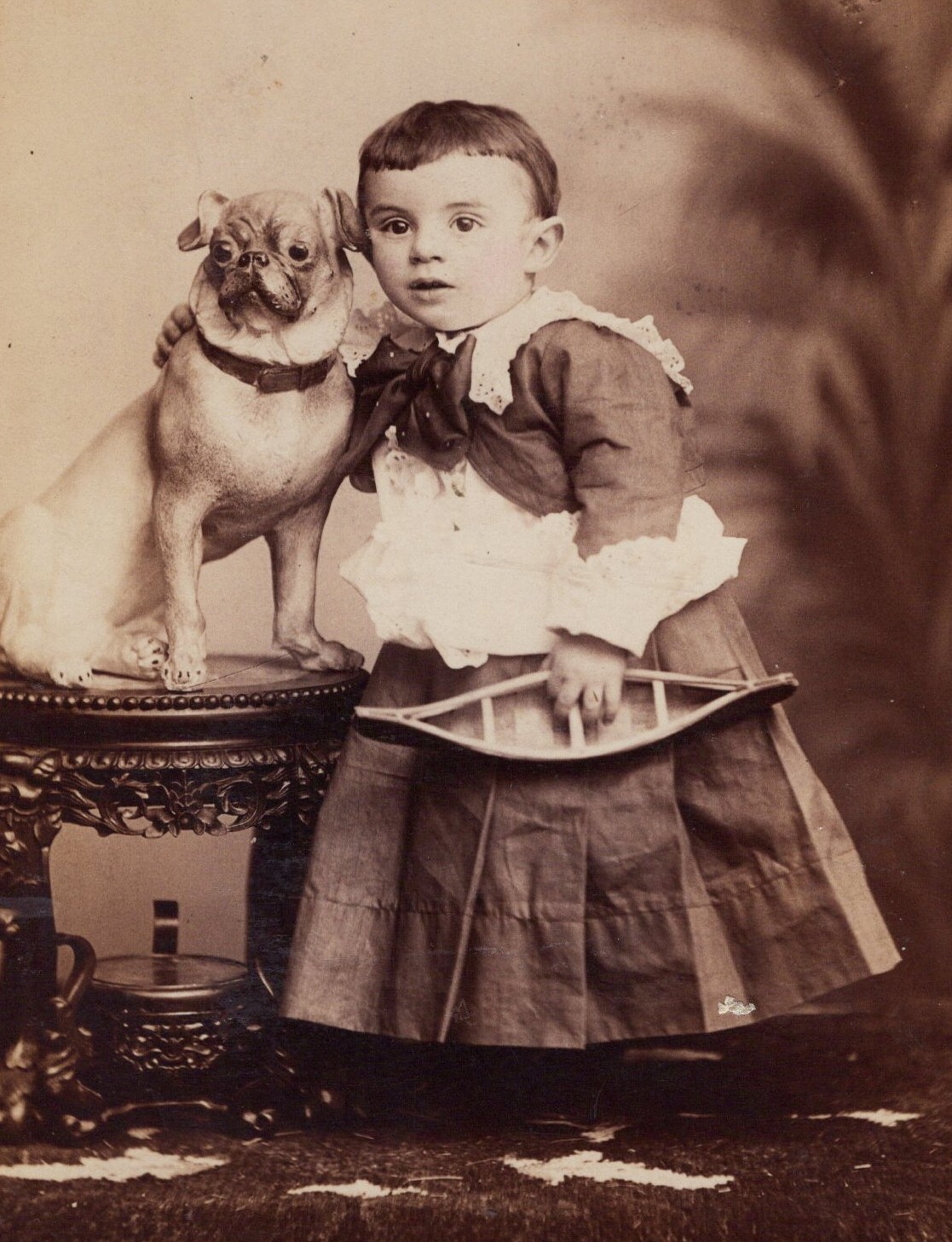This striking cabinet card photograph captures a young child, seemingly around two or three years old, standing beside a small dog that is perched on an ornately decorated pedestal table. The child, dressed in a beautifully tailored Victorian outfit, places an arm around the dog in a gentle yet confident embrace, looking directly at the camera with an expression that conveys a mix of curiosity and composure. The child holds a small wooden toy boat, a charming prop that adds an element of playfulness to the otherwise formal portrait. The child is dressed in a dark-colored, long-sleeved dress with a pleated skirt, a lace-trimmed collar, and a large bow at the neck. White lace detailing decorates the cuffs and bodice, further emphasizing the intricate craftsmanship of the garment. The child’s short, neatly trimmed hair, round face, and large eyes give them an endearing yet serious appearance. At first glance, the dog appears almost lifelike, but upon closer inspection, its stiff posture, rigid gaze, and unnatural stillness suggest that it may not be a live animal but rather a taxidermy specimen or even a sculpted prop. The dog’s breed resembles that of a pug or pug-mix, with a compact, sturdy build, a broad face, short snout, and slightly bulging eyes. Its expression is frozen in an almost human-like seriousness. The photograph is mounted on a cabinet card with elegant scalloped edges, a decorative feature that enhances its visual appeal. The photographer’s name, De Young’s, is embossed in gold lettering at the bottom, along with the studio’s address at 815 Broadway, New York. The photographer, Joseph DeYoung (1843-1919), was both well known and highly respected. He had operated his studio from a number of addresses in New York City. He left the 815 Broadway address, where this photograph was taken in about 1890. He was at that location from at least 1884. In 1907 DeYoung’s studio was involved in the apprehension of a noted thief. The studio had a display case outside the store so pedestrians could see samples of their work. The thief was caught jimmying open the case and removing two sports photographs. The police were very interested in the home address given to them by their new arrestee. They were surprised that he lived in a mansion but it made sense when they learned he was a millionaire’s butler. He had worked in that same capacity for other millionaires living in the city. When the police searched his room, they found a cache of personal items belonging to his current and former employers. Years later, a deceased DeYoung made the news because of his bizarre estate planning. When he died, he left five dollars to his wife, five dollars to his son, and one half of his business to his business partner, Matilda Wallace. The back of the cabinet card is a masterpiece in itself, featuring an elaborate gold-embossed design against a black background. Swirling Victorian filigree, floral motifs, and elegant typography proudly advertise the services of De Young’s as Photographers, Portrait Painters, and Crayon Artists. The phrase “Extra Finish” suggests that this particular image may have been a premium offering, possibly with superior printing quality or special treatment. (SOLD)