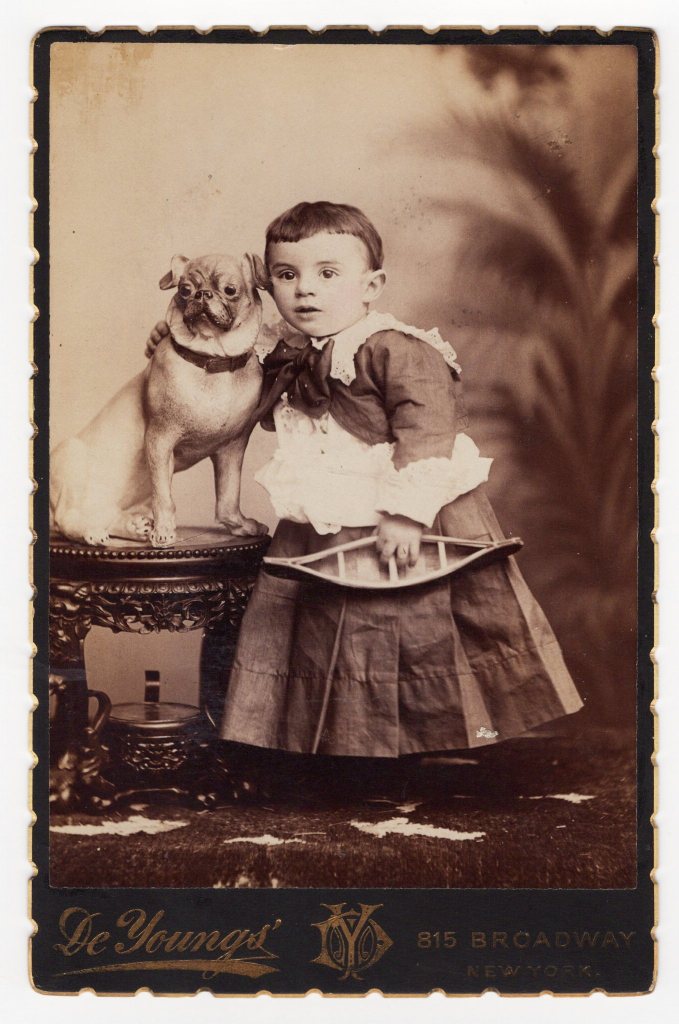 A CHILD POSES WITH HIS PUG DOG : DE YOUNGS’ STUDIO :NEW YORK CITY : CABINET CARD