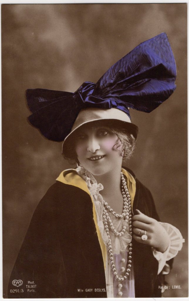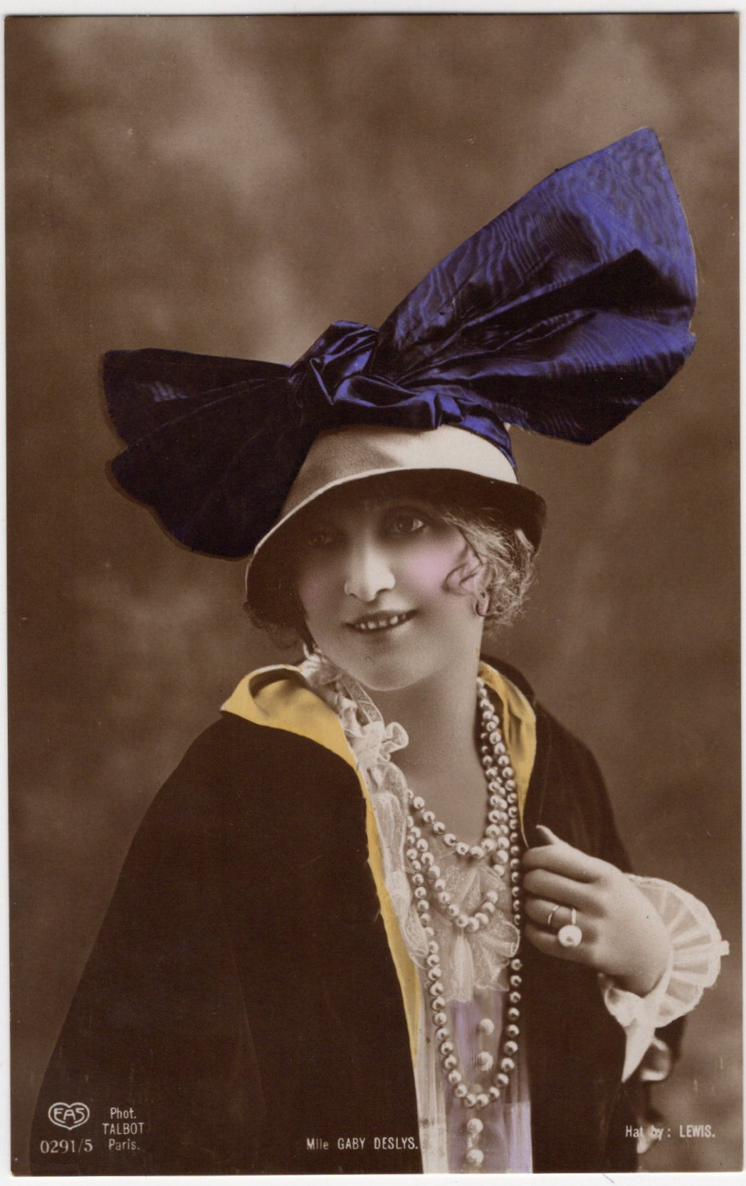 This vintage real photo postcard features a portrait of the multi talented actress, dancer, and singer, Gaby Deslys (1881-1920). Miss Deslys performed at the beginning of the twentieth century in both Europe and the United States. She was extremely popular worldwide. In fact, she was able to earn four thousand dollars a week when performing in the United States. She performed several times on Broadway. She had a dance named after her, “The Gaby Glide” (1911). You can find the sheet music, with Gaby on the cover, elsewhere on ebay. Her love life was the topic of much public gossip. She probably added to the sensationalism surrounding her by posing in a number of risque postcards. She was courted by many wealthy and powerful men, including the King of Portugal. Her life was cut short by the “Spanish” influenza. It was published by E. A. Schwerdtfeger Company of London and printed in Berlin (no. 0291/5). The company also had an office in New York (opened in 1910). This publishing house printed many different types of real photo postcards but was known for its hand-colored real photo postcards of actresses and fashionable women in exotic costumes. The photographer was the Talbot studio (Paris). The creator of Miss Deslys’s hat is also credited (Lewis). Gaby Deslys is shown in a softly lit studio setting, posed in a three-quarter view and looking directly toward the camera with a gentle, confident smile. Her expression is warm and engaging. She is wearing a fashionable cloche-style hat adorned with an enormous silk bow, dramatically oversized and extending widely on both sides of the hat. The bow has been hand-colored in a deep blue tone, making it the most visually striking element in the photograph. The photograph itself is sepia-toned, but selective hand-coloring has been applied to parts of her clothing—most notably the bow, the yellow lining of her coat or wrap, and subtle tinting on her blouse—creating a refined, elegant effect. Deslys is dressed in an elegant outfit consisting of a dark wrap or coat with a light-colored lining, worn over a delicate lace blouse. Around her neck she wears multiple strands of pearls, reinforcing her image as a glamorous stage celebrity. On her right hand she wears a ring, and her hand is posed lightly against her coat lapel, a classic studio pose meant to convey poise and sophistication. The background is softly blurred and neutral, ensuring full attention remains on the sitter. The overall composition—large hat, pearls, lace, and hand coloring—creates a strong sense of Parisian fashion and theatrical elegance from the late 1910s or early 1920s. Overall, this is a striking and stylish Paris studio portrait that captures Gaby Deslys at the height of her fame, emphasizing fashion, glamour, and personality—everything that made her one of the most famous French music hall stars of her era. This vintage postcard is in excellent condition (see scans).
