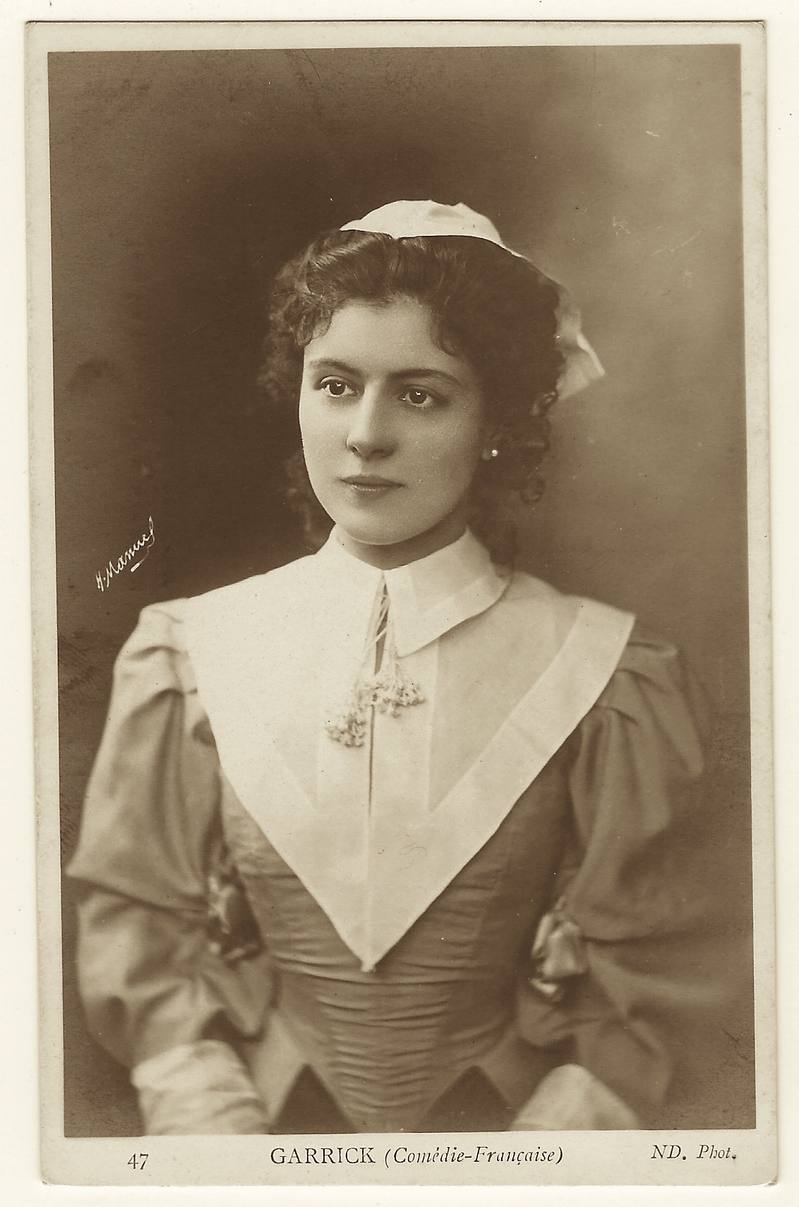 Postcard 1 provides a portrait of Mlle. Garrick during the time she was appearing at the Comedie-Francaise. The photograph was taken by Henri Manuel (1874-1947). In 1900, Manuel opened a portrait studio in Paris with his brother Gaston. He quickly became renowned for his portraits of politicians, artists, and athletes. His images were used by news agencies . His studio became the largest studio in Paris and it attracted many young photographers who sharpened their skills there. In 1925 the brothers expended their business to include fashion photography. They worked for such designers as Chanel, Patou, and Lanvin. The studio shut down during World War II and many of their photographic plates were destroyed. Manuel was the official photographer for the French government from 1914 through 1944. To view other photographs by Manuel, click on the category “Photographer: Manuel”. This portrait postcard is in very good condition (see scans).
