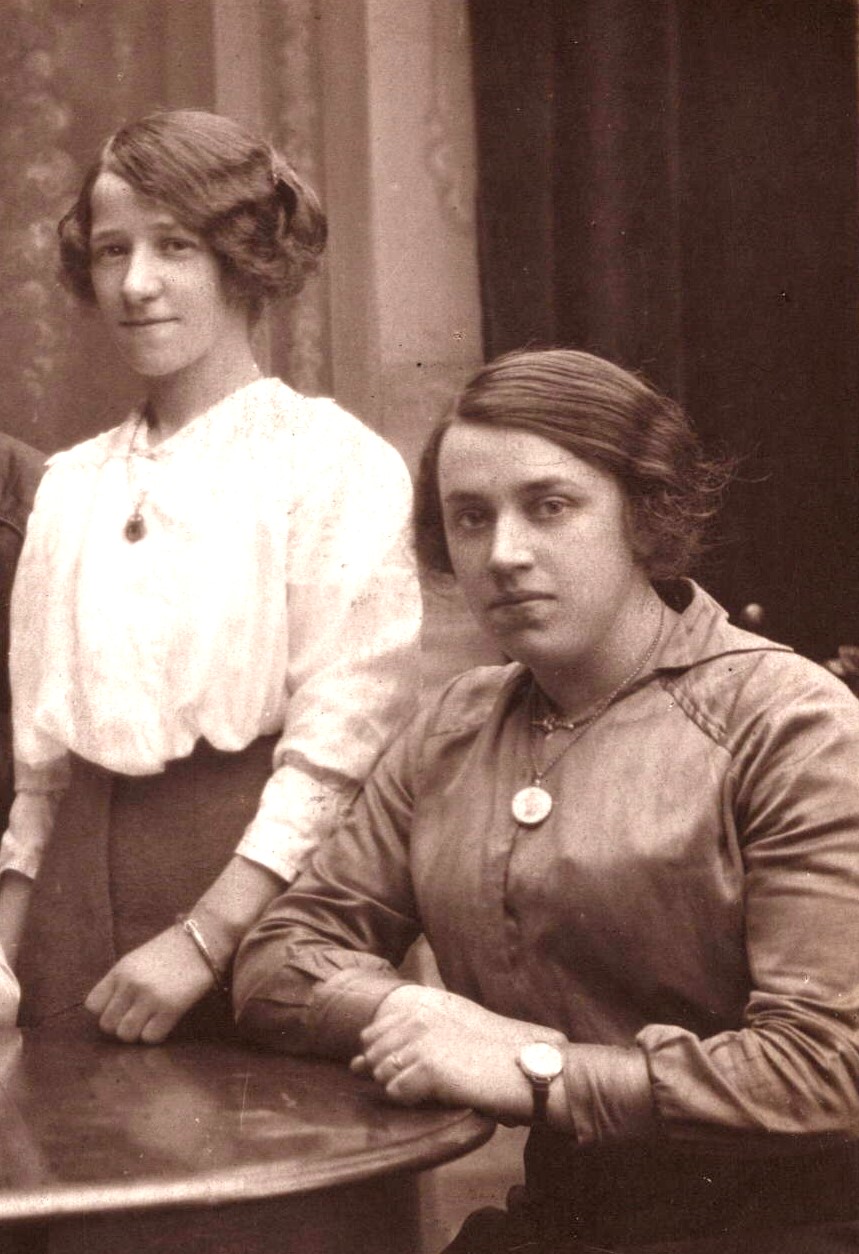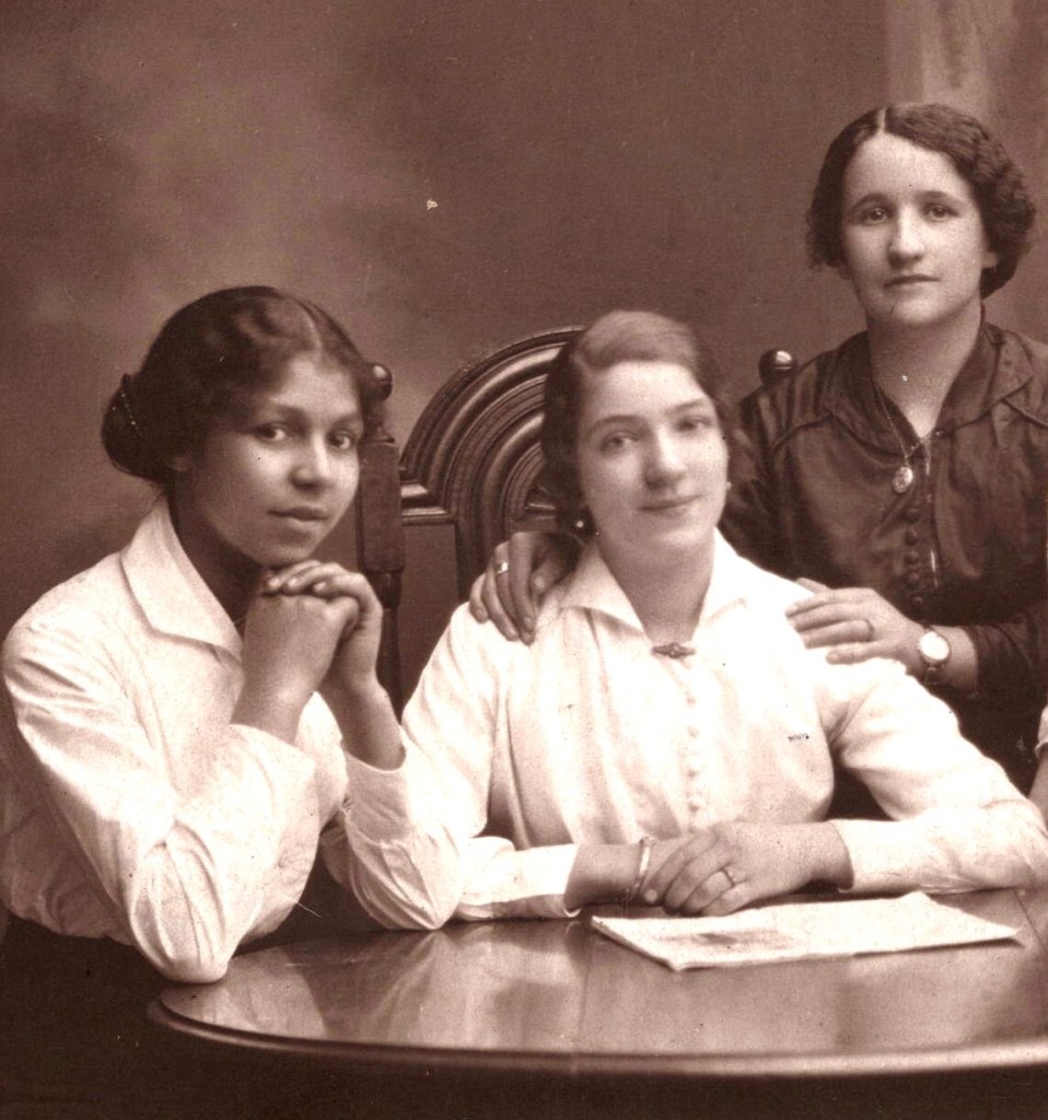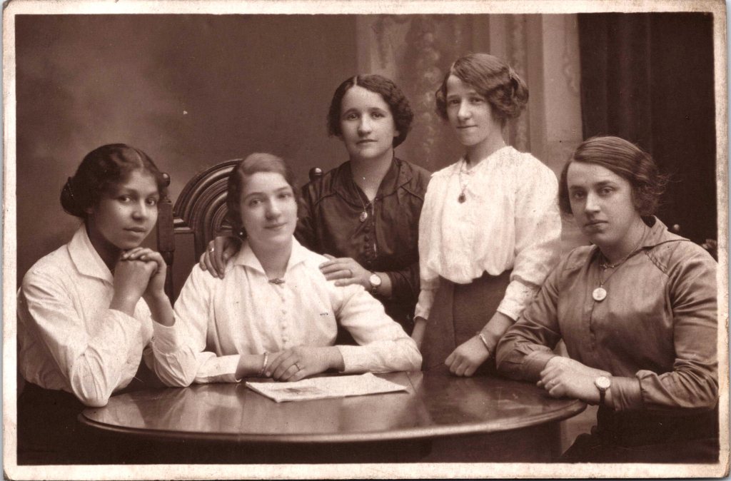 This vintage real photo postcard features a portrait of five lovely young woman sitting around a table. One of the women appears to have an unknown ethnic background or is a Black woman. This photograph was taken by Alec Roberts at the Piershill Studio in Edinburgh, Scotland. SOLD