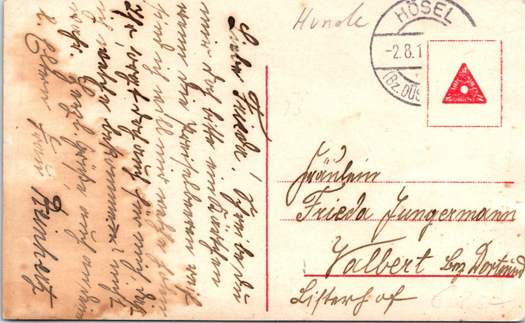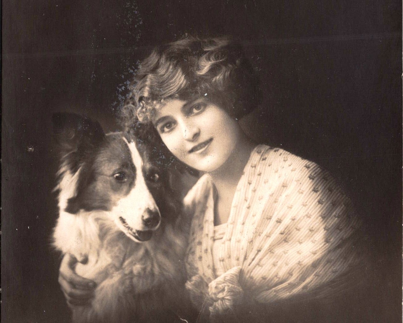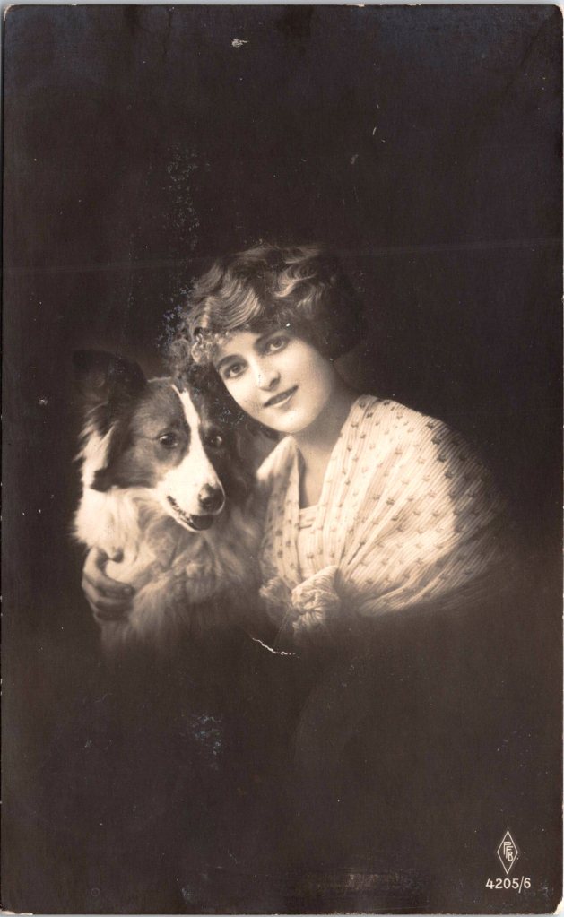 This original real photo postcard (RPPC) features a beautifully composed studio portrait of a young woman with her beloved dog, likely a Collie or Border Collie. The image is bathed in soft light, with a rich sepia tone that captures the elegance and emotion of the moment. The woman is dressed in a light-colored, delicately patterned wrap with a large bow, fashionably draped across her shoulders. Her wavy hair is styled in the popular bobbed fashion of the early 1910s, and her expression is serene, warm, and affectionate as she leans toward her loyal canine companion. The dog, with its intelligent gaze and distinctive facial markings, radiates calm and trust. Together, they project a timeless bond of companionship. In the lower right-hand corner of the card is the diamond-shaped logo “PFB”, identifying the publisher as Photochemie Paul Fink, Berlin, a prominent German firm known for high-quality photographic postcards. The serial number 4205/6 appears just below the logo. The reverse of the postcard bears a handwritten message in German and a clear postmark from Hösel (Bz. Düsseldorf). The card was addressed to Fräulein Frieda Jungermann in Valbert bei Dortmund, Germany. A rough translation of the message is “Dear Friedel! Warm greetings and kisses from all of us. We are doing well and hope you are healthy too. Looking forward to seeing you again soon. Warm regards, your parents.” (SOLD)