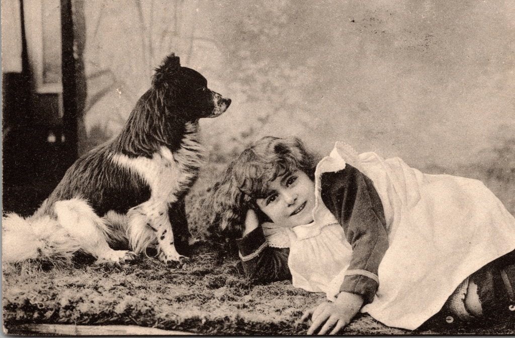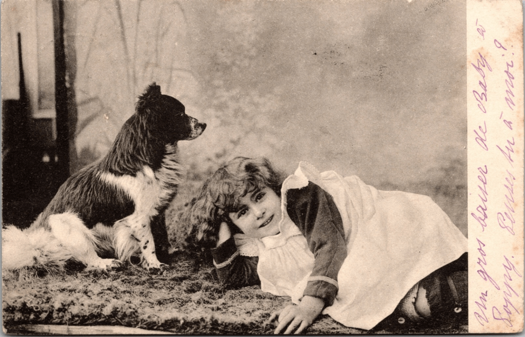 This antique undivided back postcard features a sweet little girl and her inattentive dog. The girl is adorable and is flashing a wonderful smile as she looks directly at the photographer. The dog is cute, but not cooperative with the photographer, as he looks intently away from the camera. The postcard was published by PFB (Paul Finkenrath), a Berlin postcard publishing and printing business. It is part of a series. (no. 3293). The Paul Finkenroth company made quality photo postcards and the company was heavily oriented toward export. They were known to be responsive to printing postcards that they’re customers desired over time. They were quite profitable but closed in 1911 when protective tariffs interfered with their business. The company was established by Paul Finkenrath and Paul Grasnick in 1897. The partnership lasted about a year and then Grasnick left to start his own lithography studio. SOLD