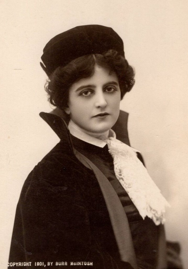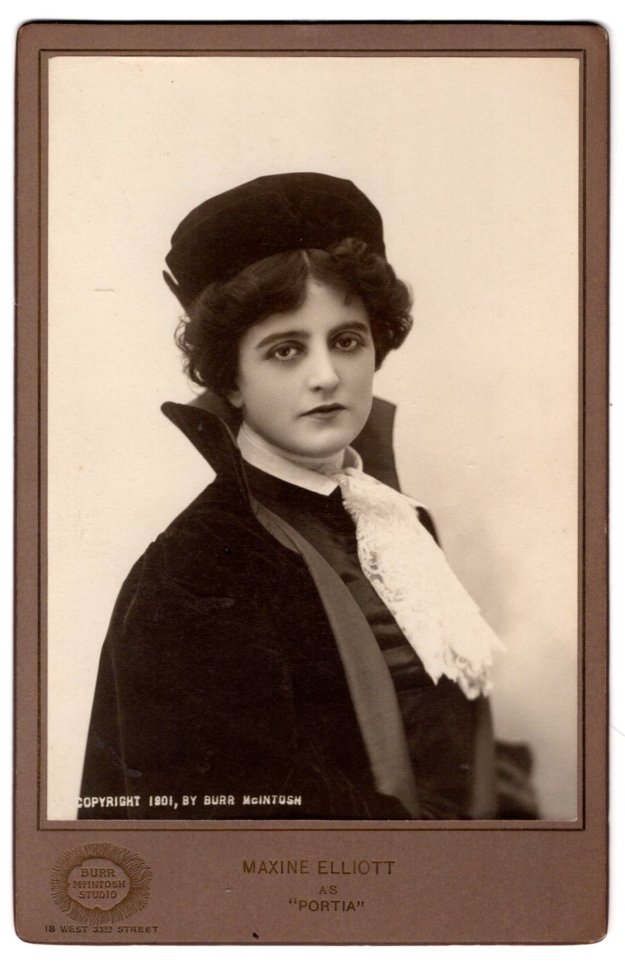 This cabinet card photograph features a portrait of beautiful stage and film actress, and businesswoman, Maxine Elliott (1868-1940). The photograph was taken in 1901 by Burr McIntosh at his New York City studio. The photograph captures her in costume playing “Portia” in William Shakespere’s “The Merchant of Venice”. Elliott was more than a stage actress. She managed her own theater and experimented with silent films in the 1910’s. Elliott was an extremely popular actress. Apparently she was popular with the men too. It is thought that she had affairs with famous people including King Edward VII and J. P. Morgan. It is also reported that she dated baseball hall of famer, John Montgomery Ward and heavyweight champion Gentleman James Corbett. During World War I she was very involved with the cause for Belgian relief. Elliott was born in Rockland, Maine. Her father was a sea captain. She had at least three siblings including her sister Gertrude Elliott, who also became a successful actress. When Maxine was 15, she was seduced and impregnated by a 25 year-old man. She may or may not have married the man but it is known that she lost the baby. In 1890 she made her first stage appearance. Her big break came in 1895 when she was hired by Augustin Daly to be the supporting actress for the highly acclaimed actress, Ada Rehan. In 1898, after divorcing husband number one, she married comedian Nat C. Goodwin. The two starred together in a number of productions including “Nathan Hale” and “The Cowboy and the Lady”. In 1903, Maxine appeared in the Broadway production of “Her Own Way” (1903). The play launched Maxine into stardom. In 1905, the play went to London where King Edward VII requested an introduction to the pretty actress. They met and then rumors started about the pair having an intimate relationship. In 1908, Goodwin obtained a divorce from Elliott. This is about the time she met 70 year-old J. P. Morgan. They became friends and rumors of their romantic involvement were never confirmed. Financial advice from Morgan helped her become a wealthy woman. The same year as her divorce, she opened her own theater, “The Maxine Elliott” in New York City. She was both the owner and the manager. In fact, she was the only woman in the US, at the time, managing her own theater. In regard to acting on Broadway, Elliott had an extensive resume. She appeared in 22 Broadway productions between 1894 and 1920. In 1913, she began acting in silent films. The IMDb reports that she was in five films including “From Dusk to Dawn” (1913), “Fighting Odds” (1917), and “The Eternal Magdalene” (1919). In 1913, Elliott went to England and started dating tennis star Anthony Wilding, fifteen years her junior. According to one source, the pair planned to marry, but he was killed in action in World War I. As a result, Elliott became obsessed with the war and moved to Belgium where she volunteered her money and time toward Belgian relief. It is reported that she also nursed wounded soldiers. Belgium recognized her by awarding her the Belgian Order of the Crown. Elliott retired from the stage in 1920. She stated that she “wished to grow middle-aged gracefully”. This cabinet card portrait features a young and beautiful Maxine Elliott. The photographer of this image is Burr McIntosh of New York City. William Burr McIntosh (1862-1942) lived an interesting life. Among his job titles listed by Wikipedia, are photographer, lecturer, film studio owner, silent film actor, publisher of the “Burr McIntosh Monthly”, reporter, and radio and early film pioneer. His sister was Nancy McIntosh, a noted operatic soprano. He was a graduate of Lafayette College in 1884. His most noted film role was his appearance in D. W. Griffith’s film, “Way Down East” (1920). Wikipedia notes that he appeared in 53 films between 1914 and 1934. This image is a beautiful remnant of turn of the century Broadway theater history. The cabinet card measures about 4 1/4 x 6 5/8 inches, has excellent clarity, and is in very good condition (see scans).