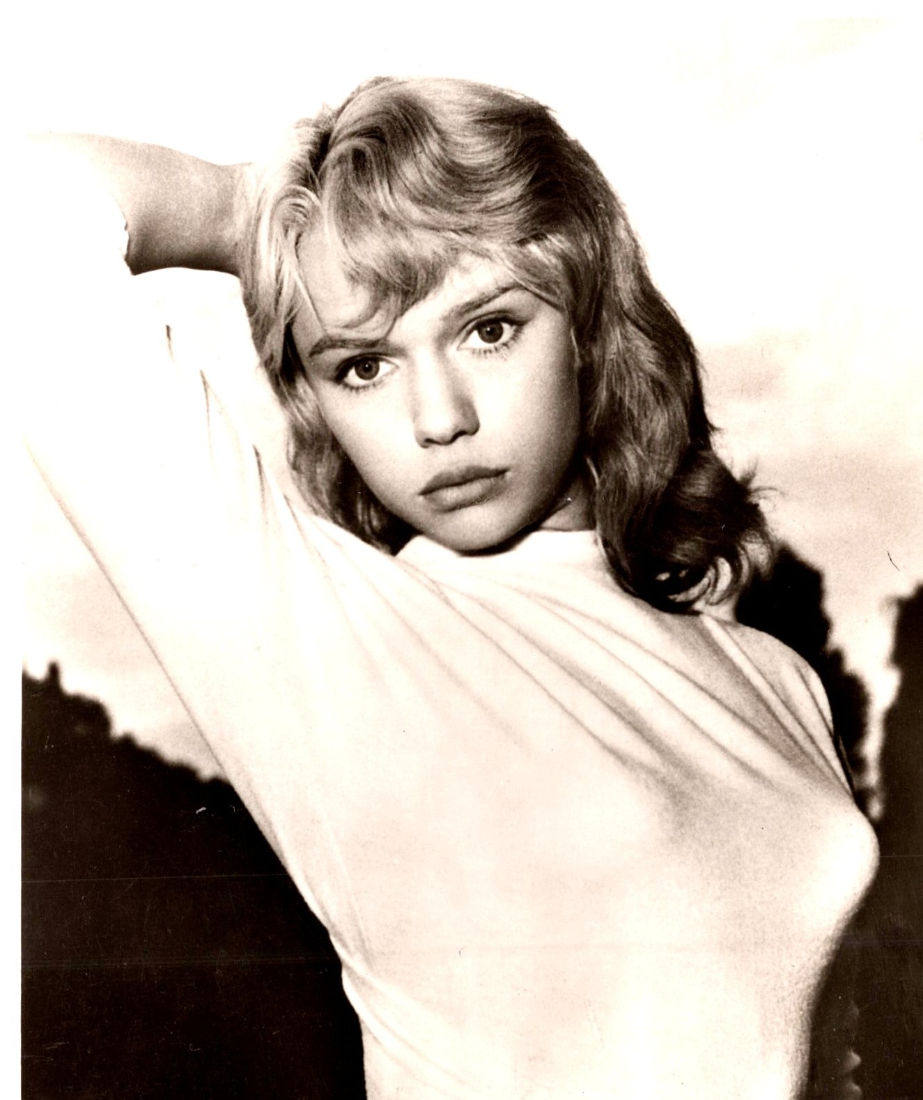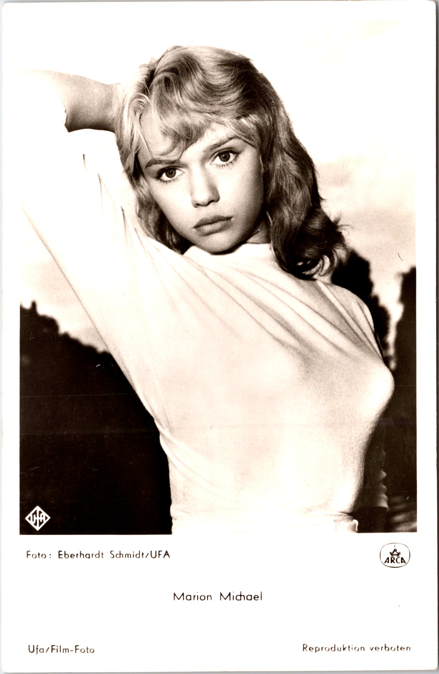 This vintage real photo postcard features German film actress and singer, Marion Michael (11940-2007). She is best known for her role in the film “Liane, Jungle Goddess” (1956). In that film, Marion became the second German actress to appear nude in a movie. It is reported that there were 12,000 actresses that competed for that role. Sadly, she was just 15 when the movie was filmed. She appeared topless in the film. Her nudity was not meant to be erotic. She was touted as Germany’s Brigitte Bardot. The movie, shot in Africa, was very popular at the box office. During the next 6 years, none of her 10 films were successful. Michael was injured in a car accident during her acting career. She returned to acting but stopped in 1965. From there on, she infrequently acted in television and film. The last film (television) she appeared in was a musical about her life. It was entitled “Liane” (1996). After retiring from acting, she worked as a sales woman. Her filmography reported by IMDb, credits her with 19 film and television appearances. Although she was not extremely successful as an actress, she was still considered a film icon in Germany. This vintage postcard was published circa 1956-1959. Michael’s photograph is attributed to Stempka/Arca Film. The card was published by UFA, a German film and television production company. This vintage real photo postcard has minor corner wear and is in overall very good condition. See Scans