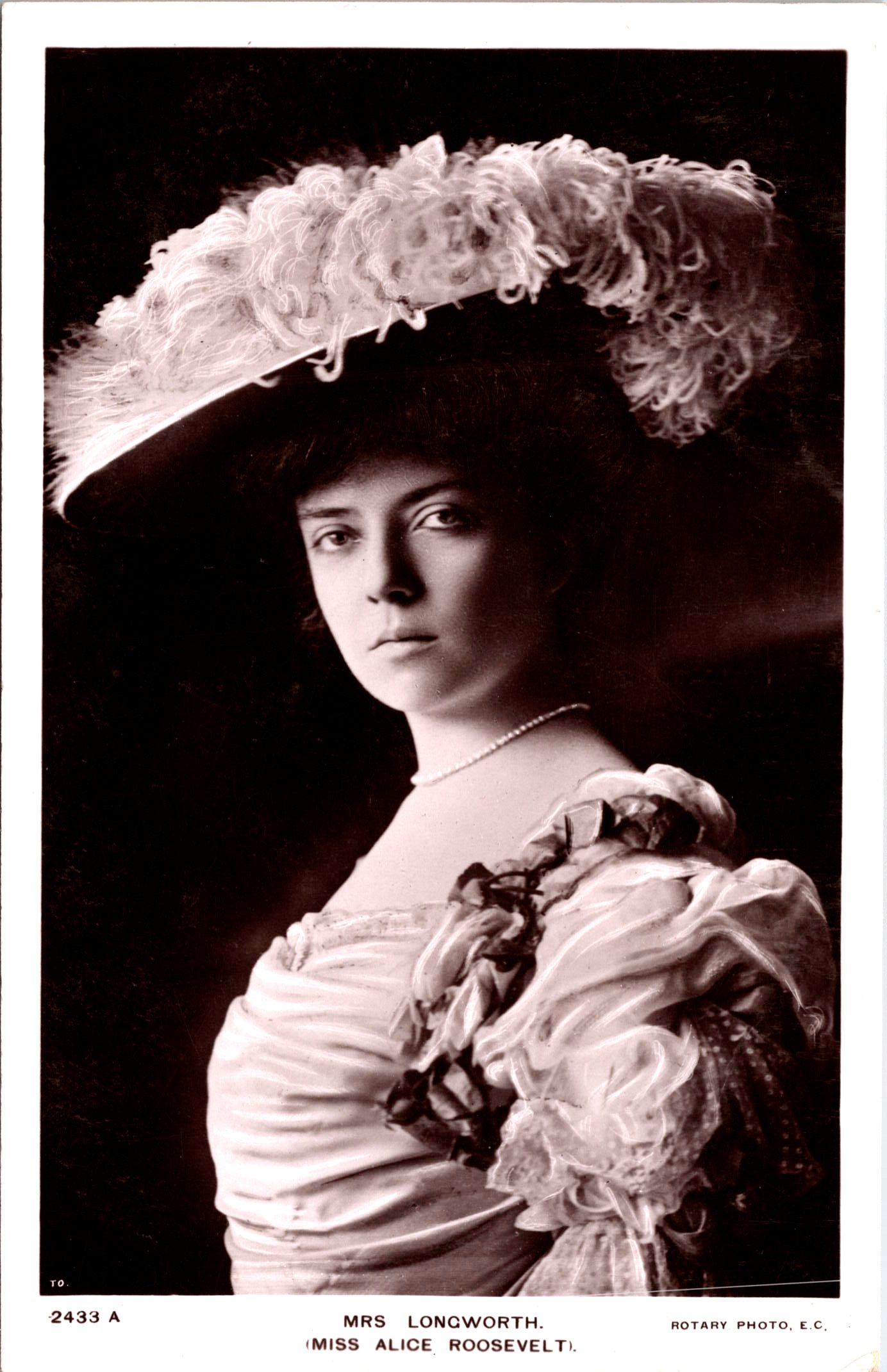 This is an original Rotary Photographic Series real photo postcard (RPPC) featuring pretty Alice Roosevelt Longworth, the vivacious and controversial daughter of President Theodore Roosevelt. The card is numbered 2433A, produced by Rotary Photo, E.C., and printed in England. This postcard is uncommon. Alice Roosevelt was one of the most famous women of the early 20th century, known for her sharp wit, rebellious nature, and scandalous behavior. Born in 1884, she was the daughter of Theodore Roosevelt and his first wife, Alice Hathaway Lee, who tragically died shortly after her birth. Raised in the White House, Alice defied convention, smoking cigarettes, gambling, and keeping a pet snake named Emily Spinach. She became the darling of Washington society, yet also a political force who influenced generations of leaders. In 1906, Alice married Nicholas Longworth, a powerful Republican congressman from Ohio who later became Speaker of the House. Their marriage, though lasting until his death in 1931, was known to be troubled. Alice’s rebellious streak extended well into her marriage. She was notorious for her extramarital affairs, the most famous being with Senator William Borah of Idaho, known for his fiery speeches and staunch independence. It was rumored that Alice’s only child, Paulina Longworth, born in 1925, was not actually Nicholas Longworth’s daughter, but rather the senator’s. Despite these scandals, Alice maintained her social standing, using her charisma and sharp wit to hold court in Washington for decades. Her attitude toward sex and politics was summed up in her famous quip: “If you haven’t got anything nice to say about anybody, come sit next to me.” This unfiltered personality made her a legend in Washington society, long outlasting her political contemporaries. She remained a major political influencer until her death in 1980 at the age of 96. Alice exudes Edwardian-era elegance in this striking postcard portrait. Her large, wide-brimmed hat adorned with ostrich feathers frames her piercing gaze and confident expression. She wears a delicate pearl necklace and an off-the-shoulder silk gown with lace and ribbon accents, embodying the high fashion of the early 1900s. Her slightly pursed lips and direct gaze hint at the intelligence and bold personality that made her a social powerhouse. (SOLD)
