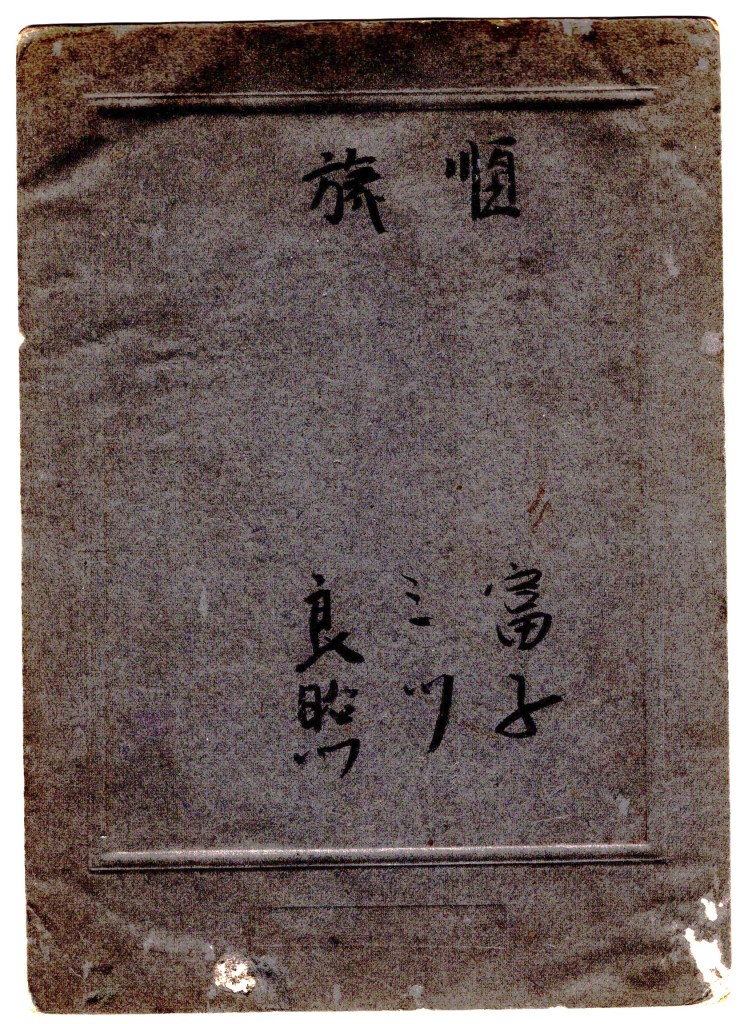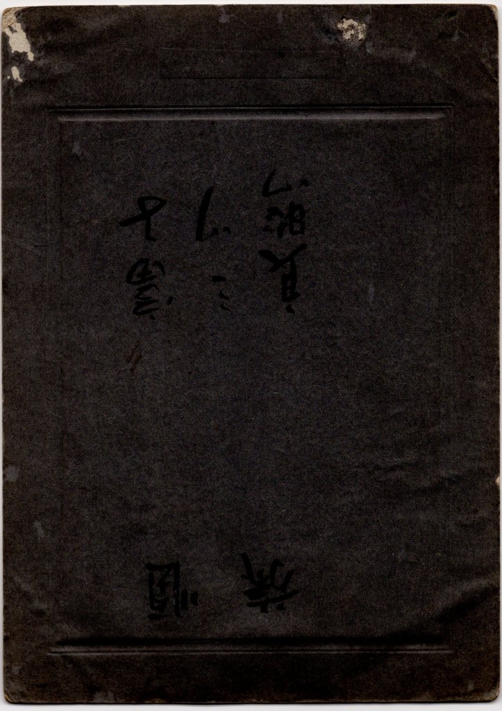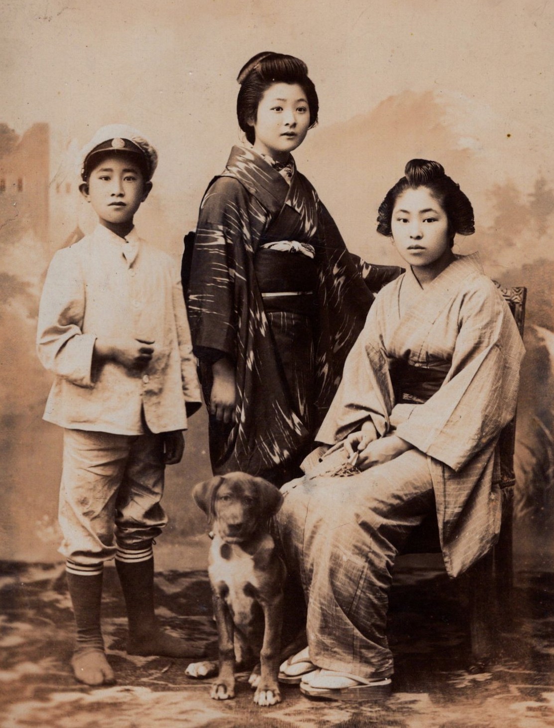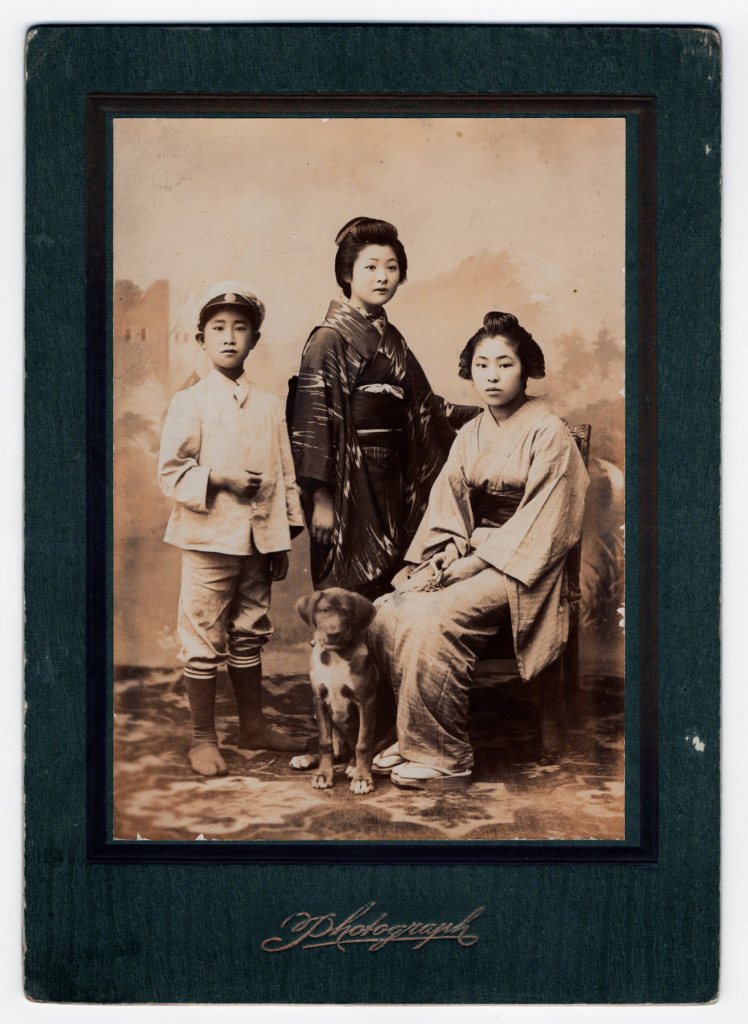 This cabinet card features a formal portrait of three individuals—two women and a boy—accompanied by a dog. The setting appears to be a professional photography studio, with a painted backdrop and a patterned floor covering. The young boy is dressed in a Western-style outfit, wearing a light-colored jacket, knee-length pants, tall socks, and a newsboy-style cap. His expression is neutral, and he holds his hands in front of him in a composed stance. The standing woman in the center wears a dark kimono with a traditional obi sash. Her hair is styled in an elegant updo, characteristic of the late Meiji or early Taisho period. She maintains a composed yet confident expression, resting one hand gently on the seated woman’s shoulder. The seated woman on the right wears a lighter-colored kimono with a darker obi. She has a calm expression and a poised posture, with her hands delicately resting in her lap. The dog, sitting in front of the group, is a medium-sized breed with a short coat. Its head is slightly tilted, giving it an endearing expression. The reverse side has handwritten Japanese inscriptions, adding to its historical interest. This cabinet card likely dates to the late Meiji period (circa 1895–1912) or early Taisho period (1912–1926), based on clothing style and photograph format. (SOLD)