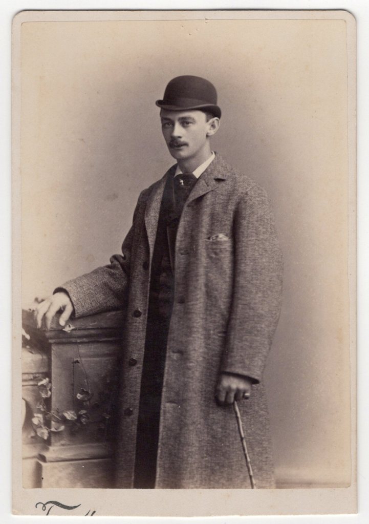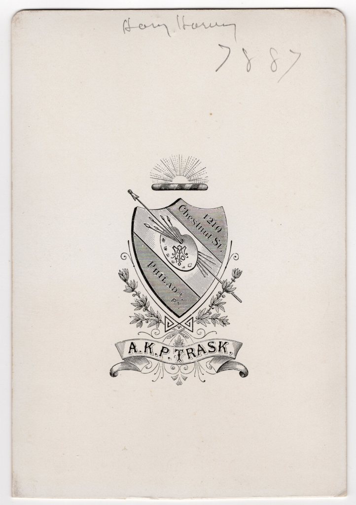 A distinguished looking and well dressed gentleman poses for his portrait in the studio of A. K. P. Trask at 1210 Chestnut Street, Philadelphia, Pennsylvania. The gentleman is dressed quite fashionably; wearing a bowler hat, a tweed overcoat, and holding a cane. The photographer, Trask, attended the 1871 convention of the National Photographic Association and the Philadelphia Inquirer (1872) reported that the pictures produced by Trask were “bewitchingly beautiful”. SOLD