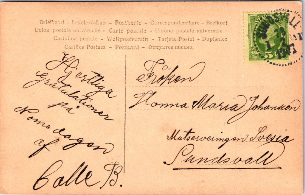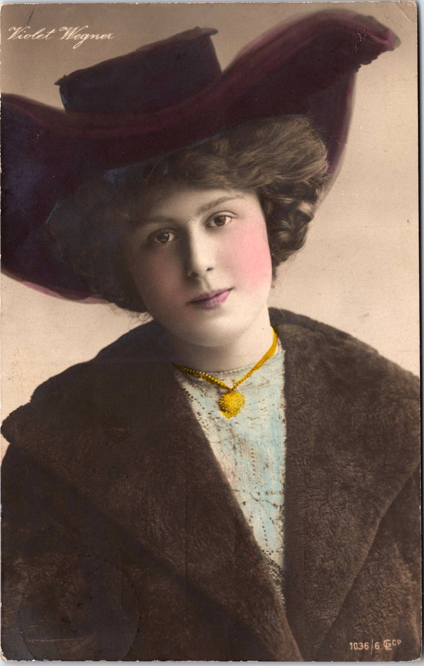 This is a beautiful and highly evocative early 20th-century hand-colored actress postcard featuring the stage performer Violet Wegner. The portrait captures her in a soft, intimate pose, gazing directly outward with a calm, engaging expression. Her face is delicately tinted, with subtle pink coloring to the cheeks and lips, while the rest of the image retains a warm sepia tone typical of the period. She is dressed in refined Edwardian fashion, wearing a large, sweeping hat in a deep burgundy tone, dramatically styled and framing her face. Her hair is softly arranged beneath it, full and carefully dressed in the fashion of the era. Around her shoulders is a rich, fur stole or coat, lending the portrait a sense of elegance and status. At her neck she wears a gold-toned necklace with a pendant, highlighted in color, which stands out vividly against her pale blouse. The overall composition is quite striking. Violet Wegner (1887–1960) was an actress who performed in cabaret. In 1924, she married Prince Peter (1889–1932), the youngest son of Nicholas I Petrović-Njegoš, the first and last king of Montenegro. She died in Monte Carlo.” At the lower right appears a small printed marking, “1036/6 G.L.C.P.”, which likely identifies the publisher and series number. The G.L.C.P. mark is associated with a European publisher of photographic postcards from the early 1900s, quite possibly German or Continental in origin. The reverse is equally interesting, bearing a clear 1907 postmark and a green 5 öre stamp from Sweden, featuring the crowned profile of King Oscar II. The handwritten message appears to be in Swedish and reads approximately: “Heartfelt congratulations on your name day. Dear greetings from …”. The postcard remains in good antique condition overall, with some light corner and edge wear. The image itself presents very well, with strong contrast and attractive hand-coloring. The reverse shows postal markings. See Scans.