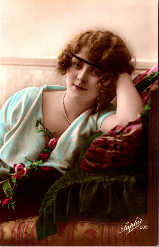 This is a beautiful and highly appealing real photo postcard featuring a glamorous young woman in a softly posed, intimate portrait that perfectly captures the elegance and style of the late Edwardian to early 1920s period. The image has been tastefully hand-colored, with delicate pink tones to the cheeks, soft natural coloring to the lips, and rich hues brought out in her clothing and surroundings, giving the portrait a warm, lifelike presence. The young woman reclines slightly, resting her head gently on her hand, her expression calm, inviting, and quietly confident. Her gaze meets the viewer with a subtle softness that gives the image a distinctly personal, almost cinematic quality. She is fashionably dressed in a light, flowing garment with soft blue tones, accented by a string of pearls around her neck. A thin dark headband worn across the forehead reflects the transitional style moving toward the 1920s, while her softly waved hair frames her face beautifully. Adding to the composition are decorative floral elements, including small pink roses woven into the scene, and richly colored drapery beneath her arm, which enhances the romantic, almost boudoir-like atmosphere. The lower right corner bears the signature “Saphir 202,” identifying the publisher—Saphir being well known for producing high-quality European glamour postcards in the early 20th century. I have found Saphir cards to be uncommon. Printing on the reverse of the divided back postcard confirms its French manufacture. The postcard is in excellent antique condition overall. The image remains vibrant with strong contrast and attractive coloration (see scans).