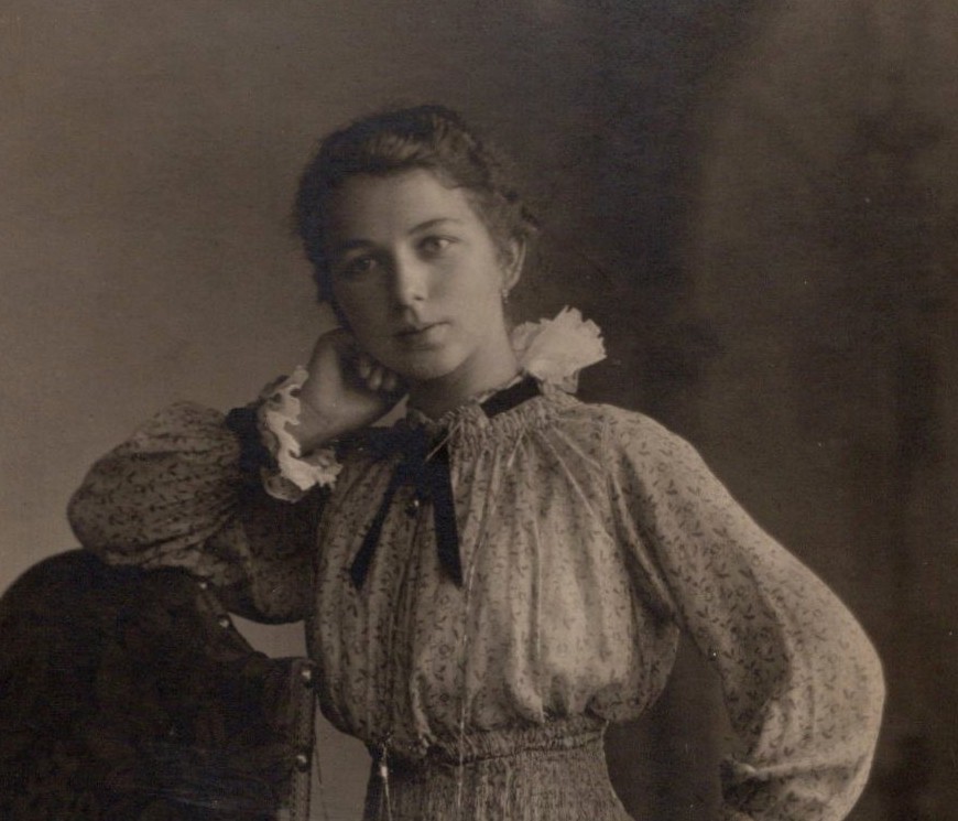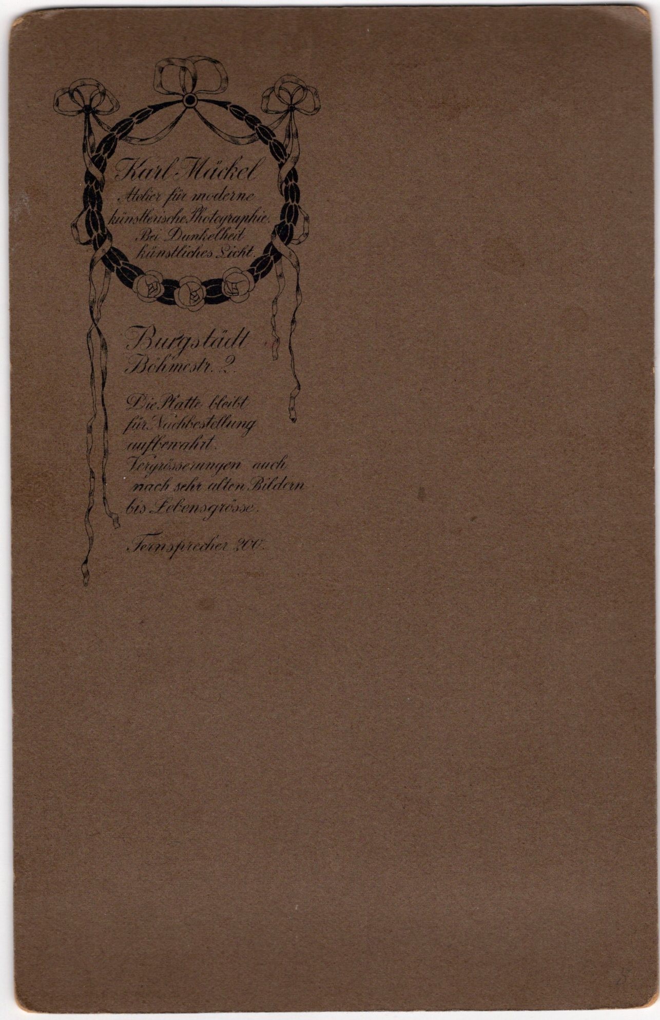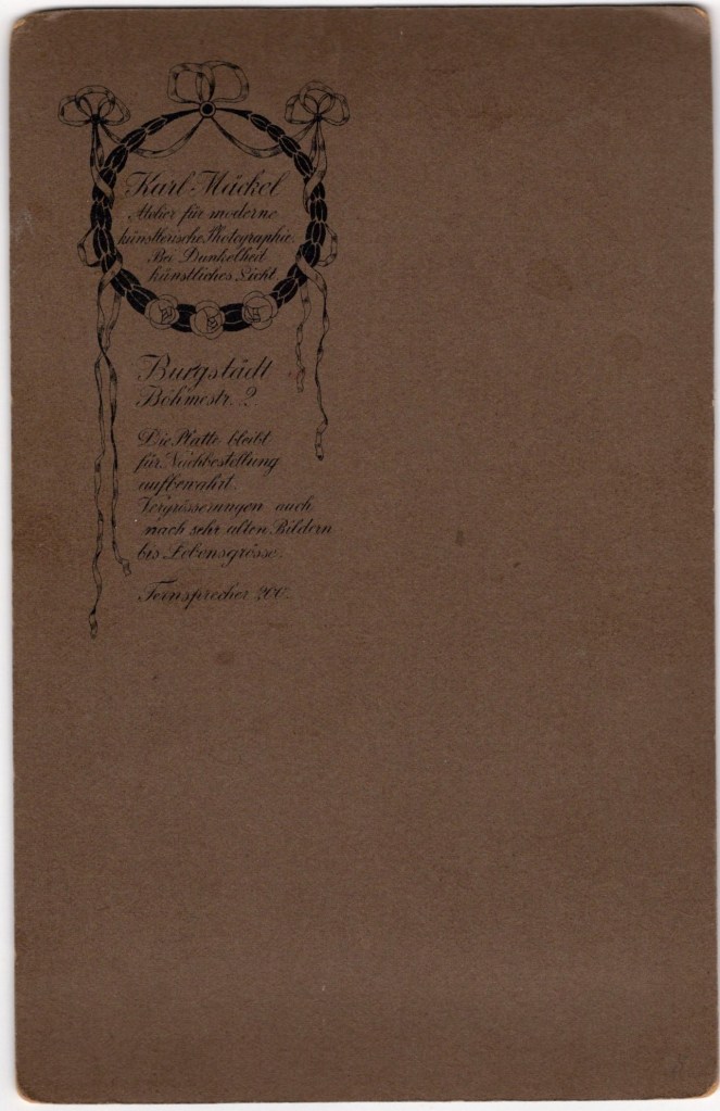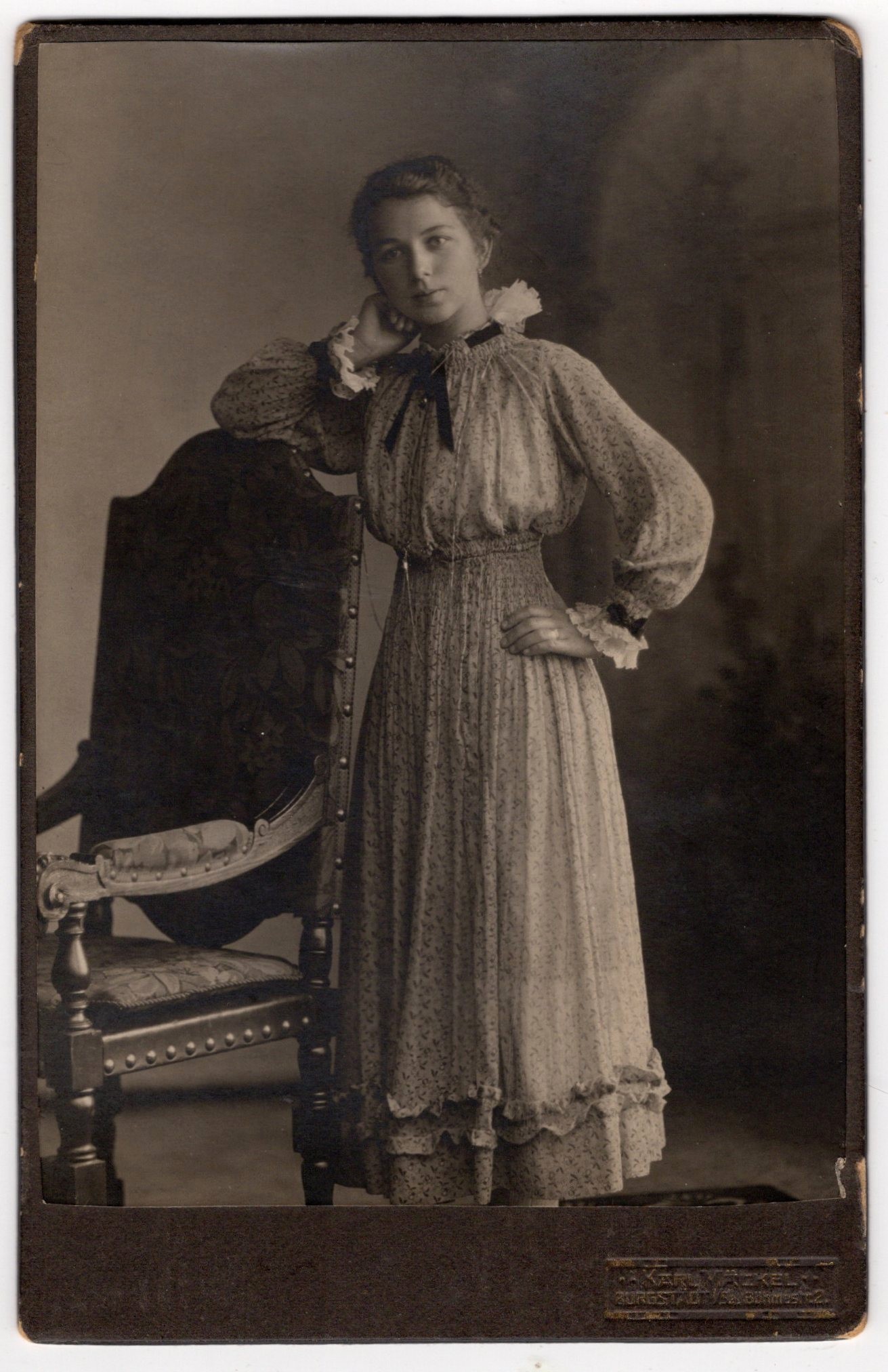 This evocative early 20th-century studio photograph presents a poised young woman photographed full-length in a formal interior setting. She stands beside an upholstered armchair, resting one hand thoughtfully against her cheek while the other is placed confidently at her waist. The pose feels both contemplative and self-assured, a balance that was highly favored in Edwardian portraiture, where sitters were encouraged to convey refinement and emotional depth. She is dressed in a long, light-colored patterned dress with a softly gathered bodice and a high, ruffled neckline accented by a dark ribbon bow. The sleeves are voluminous and finished with lace-trimmed cuffs, and the skirt falls in gentle tiers, creating a graceful silhouette typical of the period circa 1905–1915. Her hair is worn swept back and neatly styled, emphasizing her youthful face and direct, quietly introspective gaze. The photographer’s careful use of soft, diffused lighting creates a gentle tonal range, highlighting facial features while allowing the background to fall away into a subtle vignette. The overall effect is intimate and dignified, capturing both the sitter’s individuality and the aesthetics of turn-of-the-century Central European studio photography. The reverse bears an ornate printed studio mark for Karl Mückel, described as “Atelier für moderne künstlerische Photographie” (Studio for modern artistic photography), located in Burgstädt, Böhmen (Bohemia)—then part of the Austro-Hungarian Empire. The decorative wreath-and-ribbon design is characteristic of Art Nouveau–influenced photographic branding, reinforcing a date in the early 1900s. The backmark text also notes the availability of enlargements and reproductions, a common feature of professional European studios serving middle-class clientele during this period. Bohemia at the turn of the 20th century was a vibrant cultural crossroads, blending German, Czech, and Austro-Hungarian artistic traditions. Studio portraits like this one were often commissioned to mark important life moments—coming of age, engagement, or family milestones—and were prized personal keepsakes. The refined styling and professional presentation suggest a sitter from a comfortable, possibly bourgeois background. (SOLD)