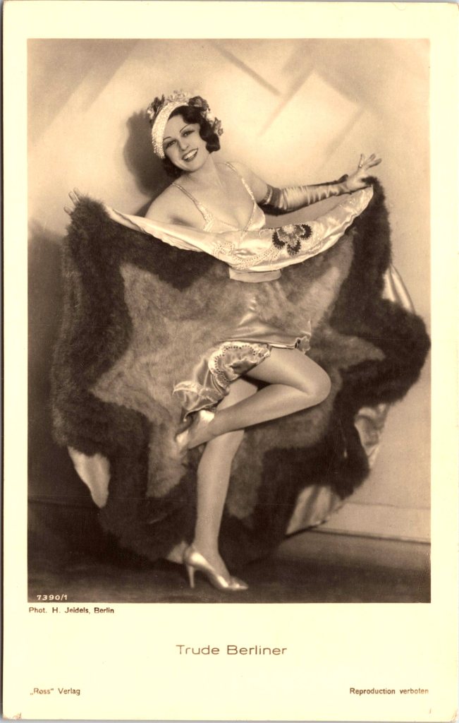 This vintage real photo postcard features Trude Berliner (1903-1977), German actress, singer and dancer. She was also a popular cabaret and comic performer at the Scala and Wintergarten in Berlin during the 1920’s. This postcard captures her doing a happy dance. The photo is risque. She is showing her bare legs and lifting her dress. Her film career took off and she ultimately appeared in 48 films between 1916 and 1955. She was in a number of well known German movies. Berliner was forced to flee Germany when the Nazis took power in 1933. She first went to France but emigrated to the United States in 1939. Unfortunately, Hollywood did not offer the kind of opportunities she experienced in Europe. She was only able to obtain bit parts in four movies. Interestingly, her first role in an American film was in “Casablanca” (1942). She left acting after 1945 and managed a date farm. This postcard was published by Ross Verlag as part of a series (No.7390/1). The photograph on this postcard was taken by H. Jeidels at his Berlin studio. (SOLD)