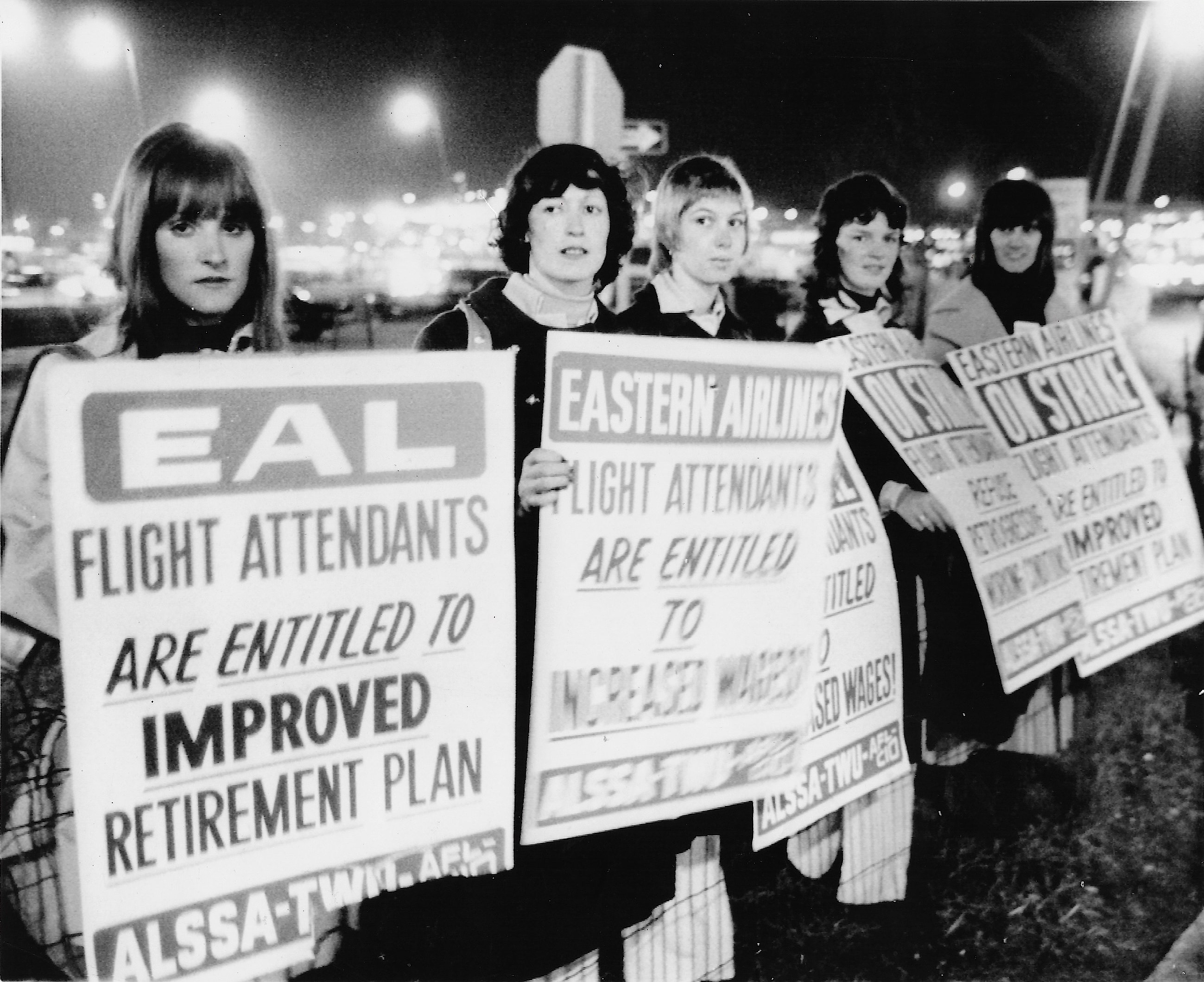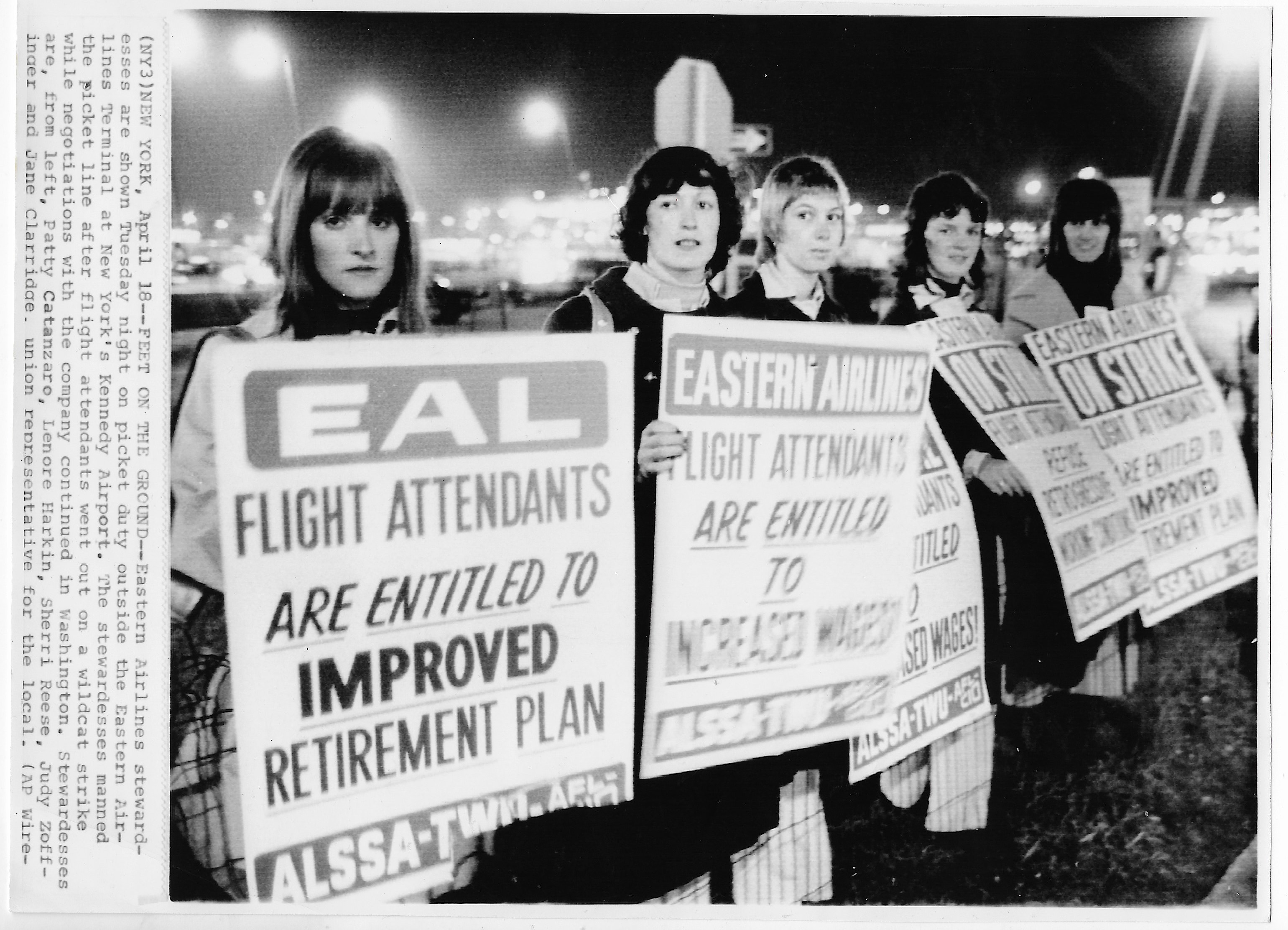 PRESS PHOTO OF FIVE EASTERN AIRLINE STEWARDESSES ON A PICKET LINE AT JFK INTERNATIONAL AIRPORT (1973)