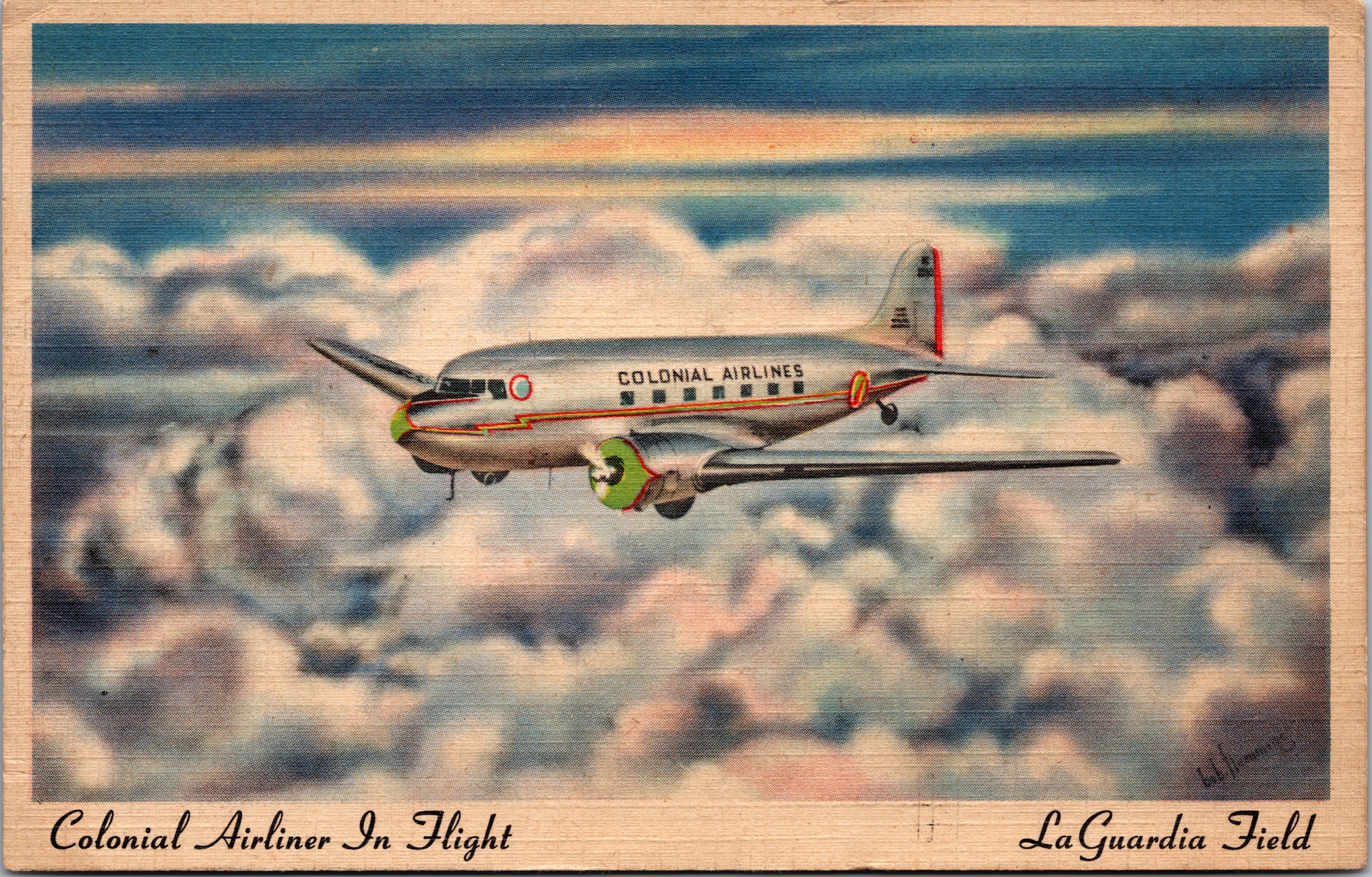 COLONIAL AIRLINER IN FLIGHT : LAGUARDIA FIELD : LINEN POSTCARD