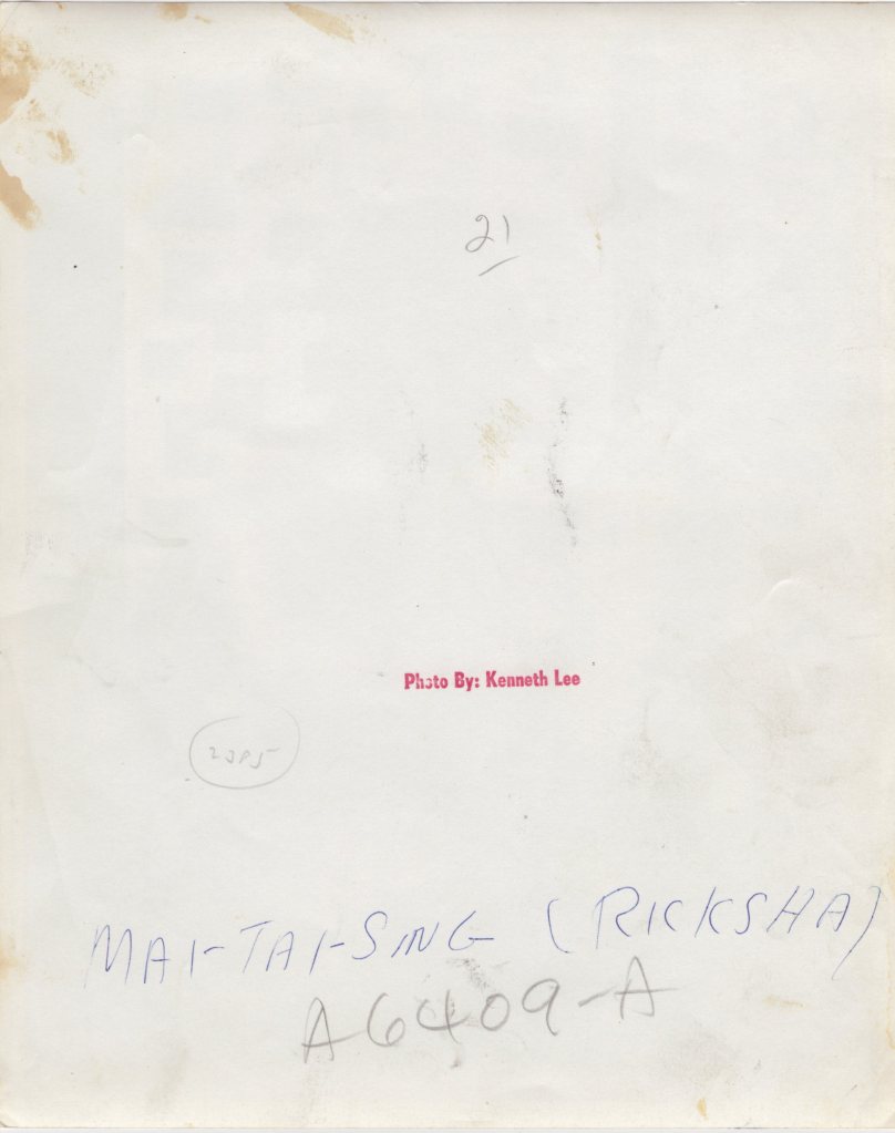 This vintage press photo features pretty American actress and businesswoman, Mai Tai Sing (1923-2018). She was born in California but spent much of her younger years in Hong Kong. She and her family moved back to California when she was about fourteen years of age. One of her first jobs was as a waitress at the Forbidden City nightclub. Her experience there sparked her interest in performing. In the early 1940’s she became a chorus girl there. She met Wilbur and Jessie Tai Sing, a dancing duo at the club. She not only replaced Jessie in the act, but also married Wilbur. In 1953, she appeared with Tony Curtis in the film, “Forbidden”. Her last film role was in “Strange Portrait”. She became romantically involved with the film’s star, Jeffry Hunter. In the 1950’s and 1960’s she also performed in television roles. Mai Tai was also involved with nightclub management. She ran a club in San Francisco named “The Rickshaw”. In the 1970’s, she relocated to Hawaii. She managed clubs there for 28 years and retired in 2003. The IMDb gives her 9 film and television credits between 1951 and 1990. Mai Tai was a pioneering Asian American actress. She did not play stereotypical Asian roles or speak in stereotypical broken pidgin English. This vintage press photo has Mai Tai Sing’s name printed on it’s reverse as well as the word “Rickshaw”. There is little doubt that this photograph was taken at the Rickshaw nightclub, where Mai Tai was hostess and manager. The photographer is identified as Kenneth Lee. His name is ink stamped on the reverse of the photo. SOLD