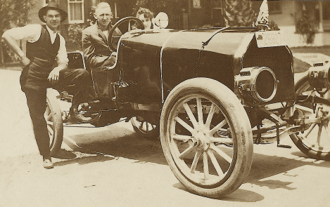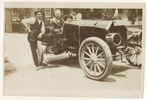 PHOTO OF A COUPLE GOING FOR A SPIN IN A VERY EARLY AUTOMOBILE