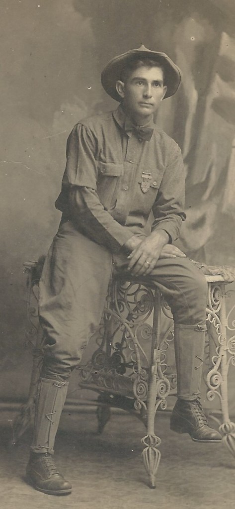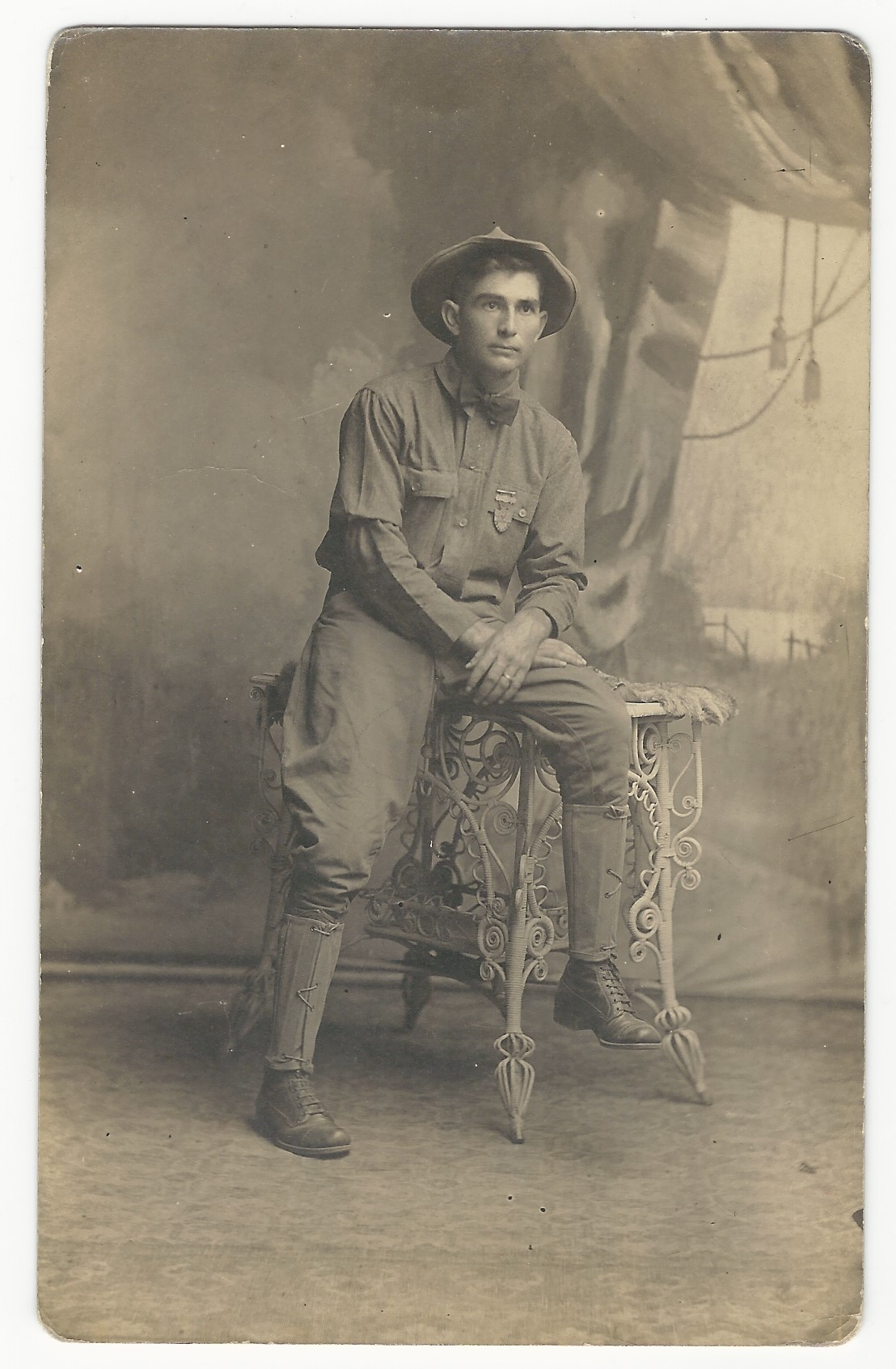 A handsome young man poses for his portrait at an unknown studio. He is in uniform, but what kind of uniform is he wearing? Is he in the military? I don’t think so. There are no patches indicating rank; nor are there any other insignias revealing a military identity. However, there is the matter of the medal that he is wearing on the flap of his shirt pocket. It certainly looks military to me. Then again, he is wearing a bow tie which argues against his uniform being military issued. The clothing that he is wearing seems appropriate for someone who is spending time in a jungle or heavily wooded environment. His soft hat and the accessory that he is wearing above his shoes may be worn in such a setting. The tied wraps around the bottom of his pant’s legs are something that I have seen worn by bicyclists of this era. Its purpose was to keep one’s pant’s legs from becoming entangled in the spokes of the bicycle wheels and causing a nasty spill. Does the gentleman in this photograph use a bicycle in his work? If so, where is the bike? I have lots of questions, and unfortunately, no answers. I need some help on this one. Hopefully a Cabinet Card Gallery visitor will be able to provide more information about this photo. Guesses are welcome too. The AZO stamp box on the reverse of this postcard indicates that the card was published sometime between 1904 and 1918. This vintage photograph has excellent clarity and is in good condition (see scans).