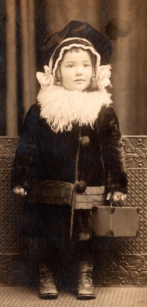 This vintage real photo postcard features a little girl dressed in winter clothing and carrying a miniature suitcase. The “suitcase” may actually be a pocket book. Note the child’s button shoes. The postcard’s AZO stamp box dates this card to sometime between 1904 and 1918. SOLD