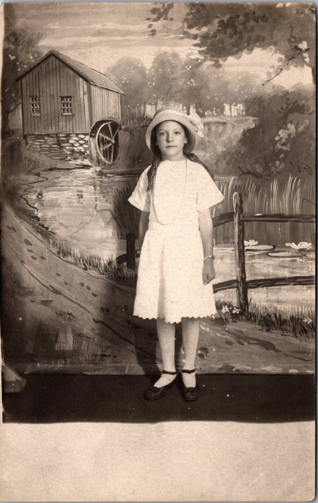 This vintage real photo postcard features a portrait of a young girl standing in front of a painted backdrop of a water mill. The artwork is very detailed. The child in this image is wearing an adorable hat, a bracelet, and Mary Jane shoes. The card has an AZO stamp box indicating it dates back to sometime between 1904 and 1918. The postcard has an almost undetectable pinhole located in the leaves above the child’s head. Overall, the postcard is in good condition (see scans). SOLD