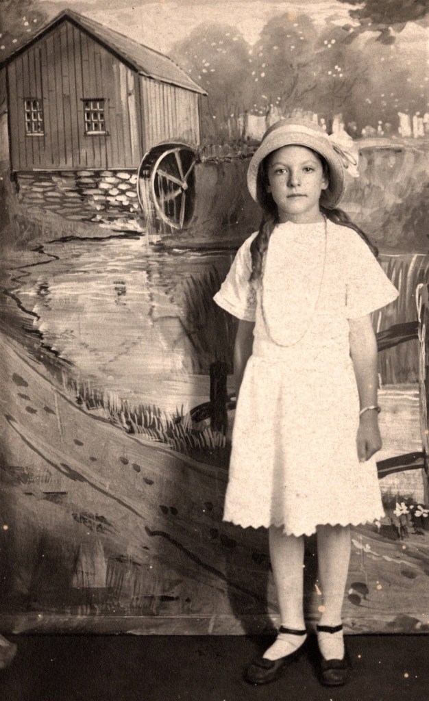 A YOUNG GIRL POSES BY A FAUX STUDIO WATER MILL : MARY JANE SHOES : (1904-1918)