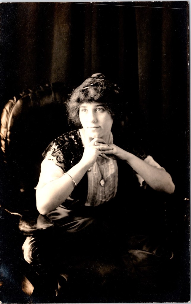 This vintage real postcard features a portrait of a woman deep in thought. She is wearing a bracelet, ring, necklace, and a hair ornament. This photograph was taken by W. S. Mynster. The card has an AZO stamp box indicating that it dates back to between 1904 and 1918. This postcard is in very good condition (see scans).