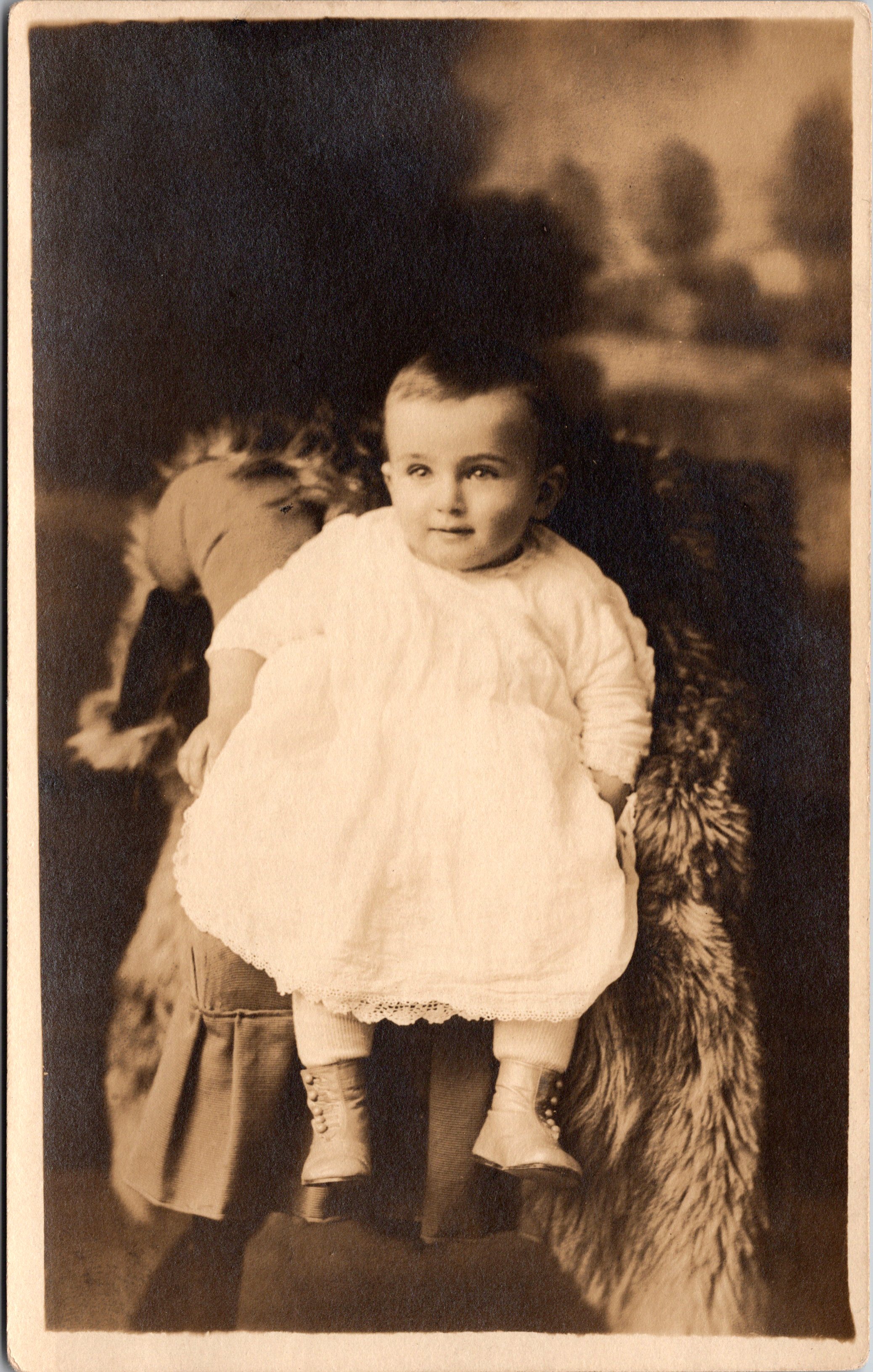 This vintage real photo postcard features a smiling baby sitting on a fur covered chair. The child is not sitting on the seat unsecured. The baby is likely sitting on his mother’s lap. Mom is hidden from our view. It is also possible that the baby is being held in place by a brace hidden by his gown. An inscription on the reverse of the card reveals that the child’s name is Vernon Walker. This postcard has an AZO stamp box which indicates that the card dates back to between 1904 and 1918. This vintage postcard is in very good condition (see scans). SOLD