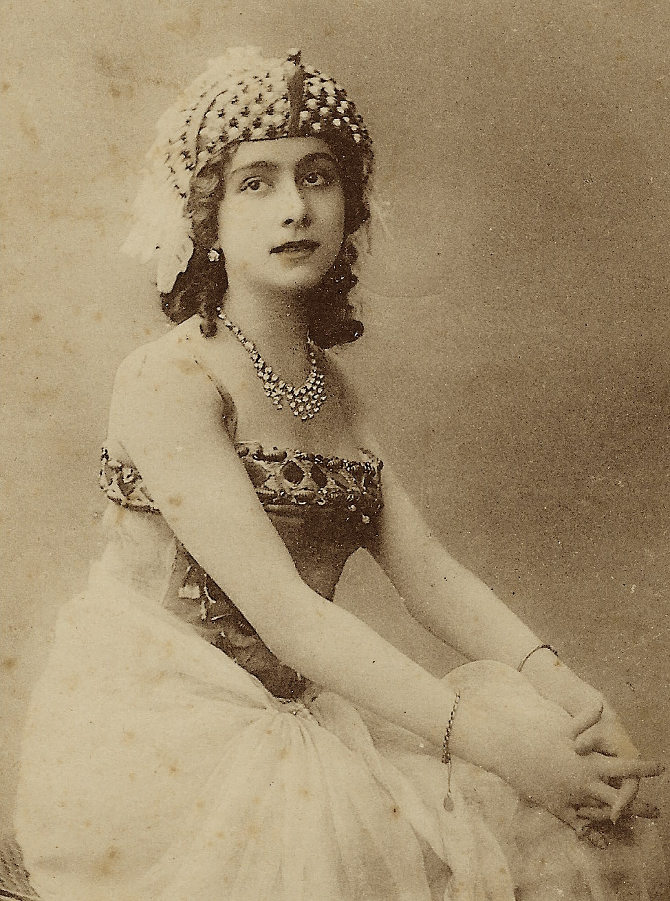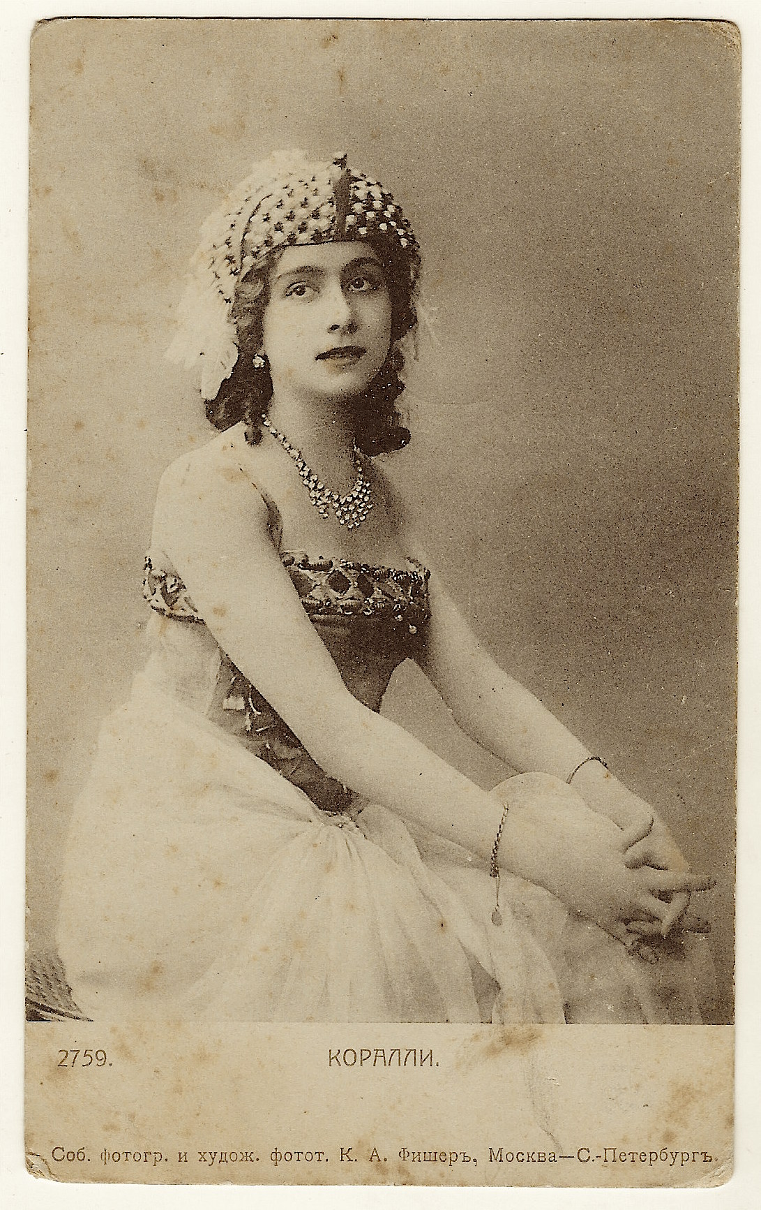 This vintage real photo postcard features Russian ballerina, choreographer, and silent film star, Vera Karalli (1889-1972). She was born in Moscow. Her father was an entrepreneur and her mother was an actress. Karalli was active between 1914 and 1921. Karalli was a graduate of the Moscow Theatre School in 1906. She performed in the Ballets Russes company in 1909, and then again, in 1919 and 1920. She was a soloist with the Bolshoi Theater and after two years became a ballerina in 1915. She often danced with ballet star, Mikhail Mordkin. Karalli becan acting in 1914 and she became one of Russia’s most celebrated film actresses. From 1914 to 1919, Karalli appeared in about sixteen Russian silent films. One of these films was an adaptation of Tolstoy’s “War and Peace”. Her last film was a German drama released in 1921. Karalli was a mistress of the Grand Duke Dmitri Pavlovich of Russia. He was the cousin of Nicholas II. It was reported that she was a co-conspirator in the 1916 murder of Grigori Rasputin. After the October Revolution, she fled to the West. Between In the 1920’s she taught dance in Lithuania. Between 1930 and 1935 she was ballet mistress of the Romanian opera in Bucharest. She lived in Paris between 1938 and 1941. She later settled in Baden, Austria. (SOLD)