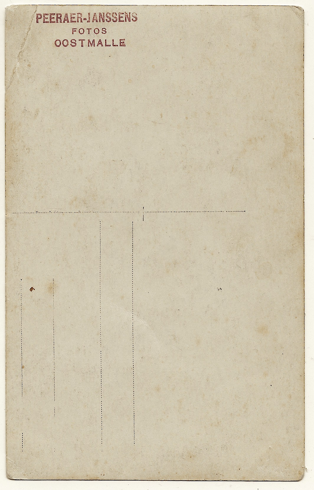 A nicely dressed man poses next to a stool in this vintage real photo postcard. His hat is “strategically dipped” and his the large chain of his pocket watch is very prominent on the lapel of his coat. The gentleman’s photograph was taken by the Peeraer-Janssen studio which was located in Oostmalle, Belgium. The photographer’s stamp is on the reverse of the card. This postcard portrait is in good condition.
