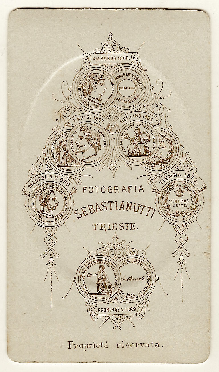 This oval carte de visite photograph features an attractive young woman. Her hair is styled and she is wearing jewelry. The woman appears to be affluent. The photographer of this cdv is Guglielmo Sebastianutti (1825-1881). He has one portrait in England’s National Portrait Gallery. The portrait above is an early cdv image. It is evident that the photograph is from the early cdv era because the Sebastianutti died in 1881 and because the years he won photography awards reveal the approximate time this photo was taken. The reverse of the photograph lists a number of awards won by the photographer. He was recognized in Berlin, Germany (1865), Paris, France (1867), Hamburg, Germany (1868), Groningen, Netherlands (1869), and Vienna, Austria (1870), Since Sebastianutti’s photography career ended in 1878, it is clear that this image was taken between 1870 and 1878. Sebastianutti’s studio was located in the city of Trieste, which is a port city located in northeast Italy. During Sebastianutti’s career, he partnered with celebrated German photographer, Franz Benque (1841-1921). Benque moved to Trieste in 1864 and partnered with Sebastianutti in the opening of a photography studio. At the time Sebastianutti was watchmaker. In 1868, Benque married Sebastianutti’s step-daughter, Isabella. Despite the success of his studio, Benque returned to Germany in 1869, and opened a studio with his cousin, Conrad Kindermann, in Hamburg. Benque must have had wanderlust because in 1870, he immigrated with his family to Brazil. There, he partnered with Alberto Henschel (1827-1882) and operated studios in Bahia and Pernambuco. Benque’s studios gained the reputation of being the best in all of Brazil. In 1878, Benque must have had another episode of wanderlust which propelled him back to Trieste and a partnership with Sebastianutti. Benque must have had one more “relocation” left in him. In 1903 he moved to Villach, Austria. This cdv image is in very good condition (see scans).