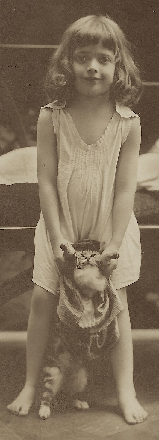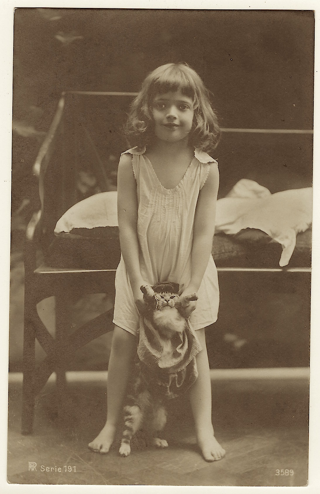This vintage real photo postcard features an adorable little girl hugging her tortoise shell tabby cat. The child appears entranced by the gorgeous feline. This postcard was published by Alfred Noyer. He was a well known and acclaimed photographer. His Paris studio operated between 1910 and the 1940’s. This postcard is dated in the year, 1920. The card is color tinted and part of a series (no1352). I used an online translation app to learn the meaning of the caption at the bottom of this photo postcard. The translation is “