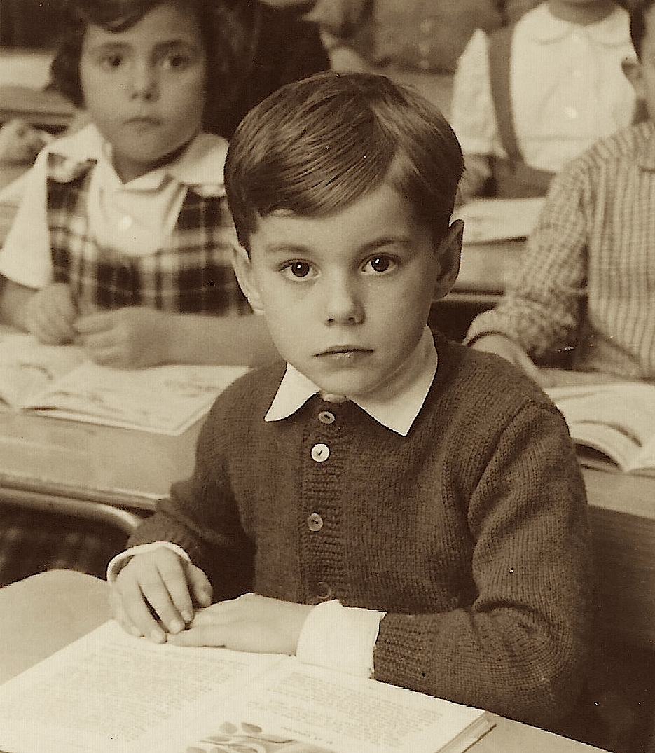 This vintage photograph features a most adorable schoolboy sitting at his desk. An open book, awaiting attention, sits on his desk. The wide-eyed boy is dressed beautifully and he is well coiffed.. Mom must have known it was picture day for his class. This photograph was likely taken sometime in the 1940’s or 1950’s. The photo measures about 3 1/2″ x 5″ and is in excellent condition.