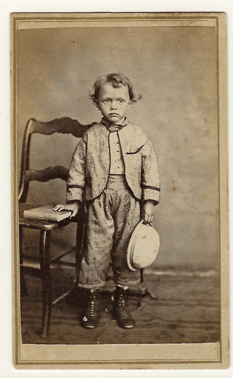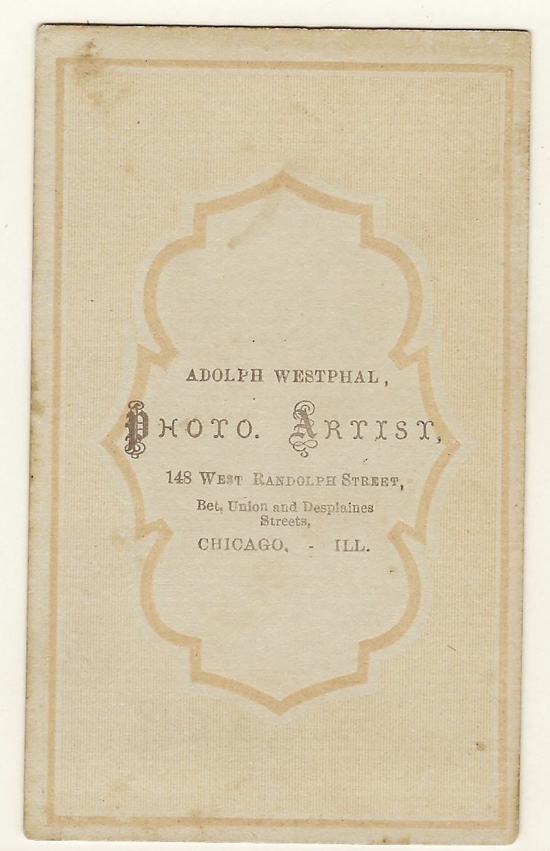 This cabinet card portrait features an adorable little girl with a terrific smile. She is holding her china head doll. The close-up view of the child makes this image quite special. The photographer of this photograph was Fred Jorns who operated a studio in Girard, Illinois. Frederick W. Jorns (1857-1943) was once partnered with William L Harrod in operating a studio in Girard. In addition they operated the Jorns and Harrod Palace Art Car. This was a mobile studio that travelled the rails stopping in towns in Illinois, Indiana, and Kentucky. The studio car was pulled by an engine from the Cincinnati-Chicago and St. Louis Railroad. An 1892 photo of the studio rail car can be seen below. Fred is the gentleman wearing the suit. Jorn’s father, Gustav Jorns, immigrated from Germany in 1848. He married in 1856 and learned the photography business from his brother-in-law. Gustav established a photo studio in Springfield, Illinois. Gustav’s son, Fred learned the photography business from his father and set up his own studio in Girard. Fred married Lena Hann in 1884 and a portrait of the couple can be seen below.The couple travelled together on the Palace Art Car leaving their three children with relatives. Jorns sold his photography business around 1901 and became a grocer. He later resided in the Oklahoma Territory and then Houston, Texas. Please note the cabinet card portrait below which captures Fred Jorns reclining on a chaise. Initial research was unsuccessful in determining whether Fred Jorns operated his studio alone before he partnered with William Harrod or visa versa.